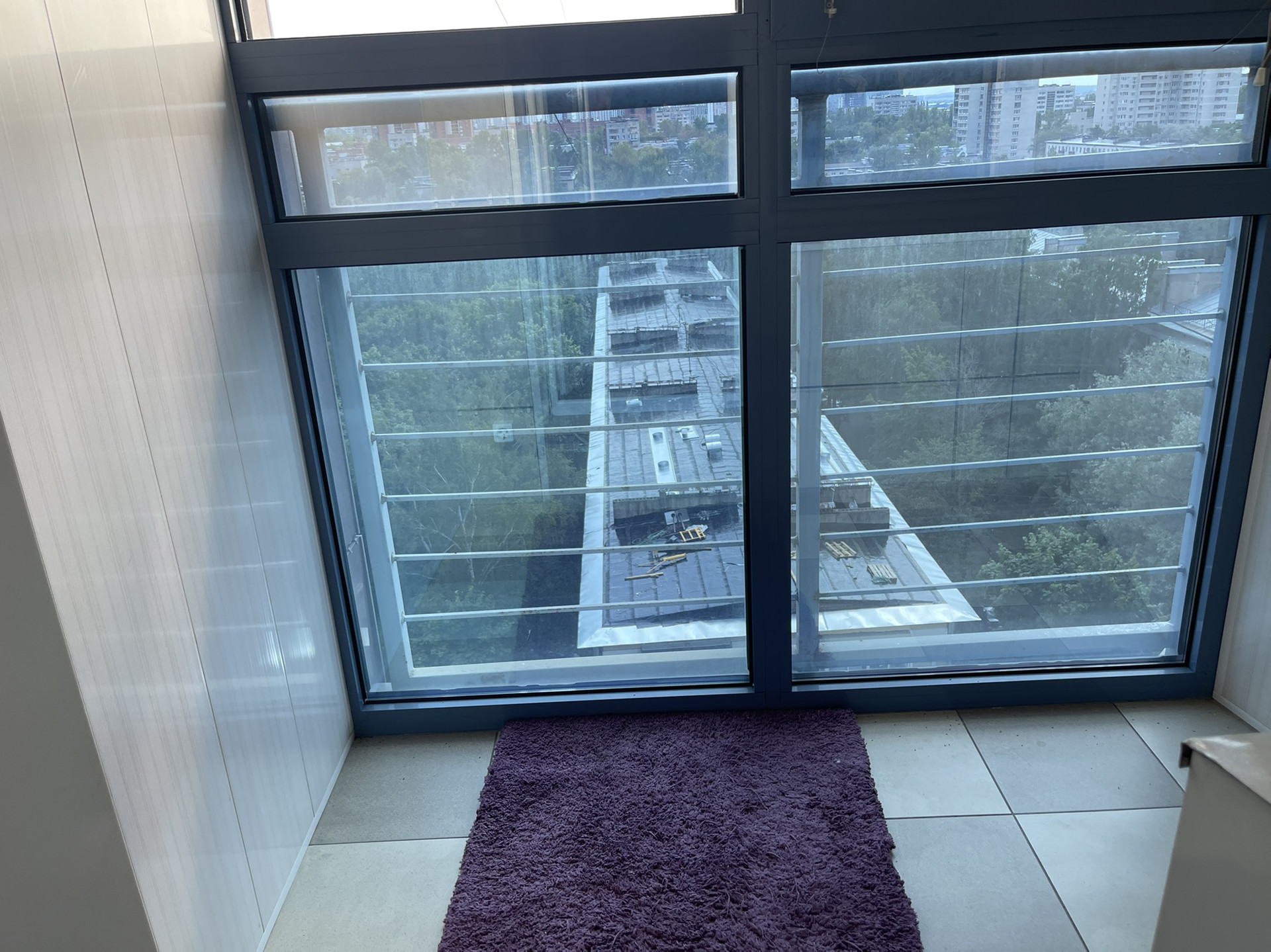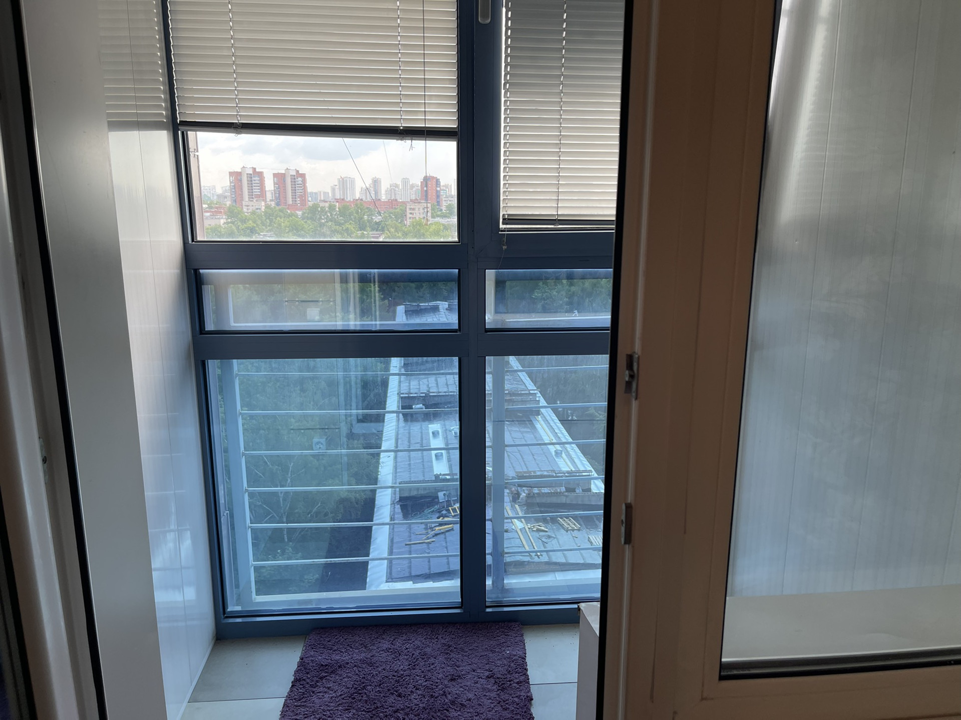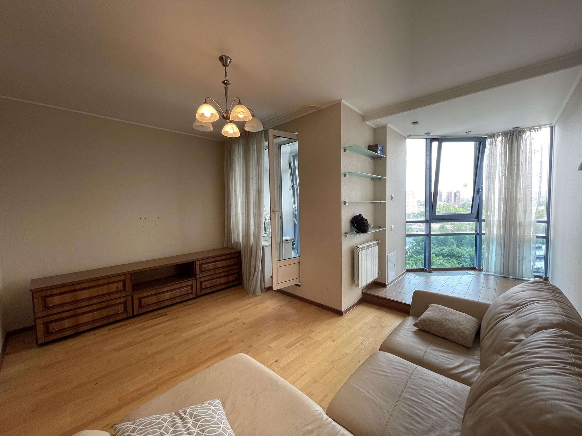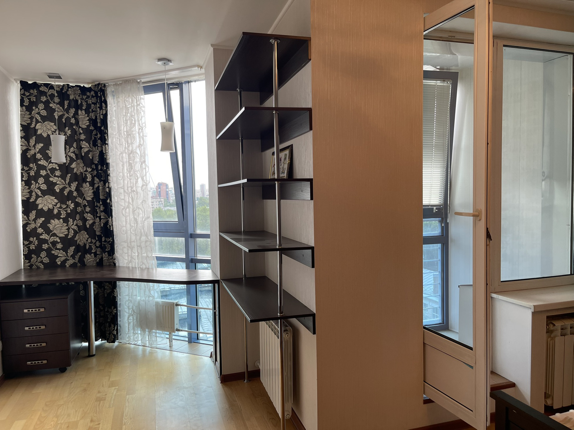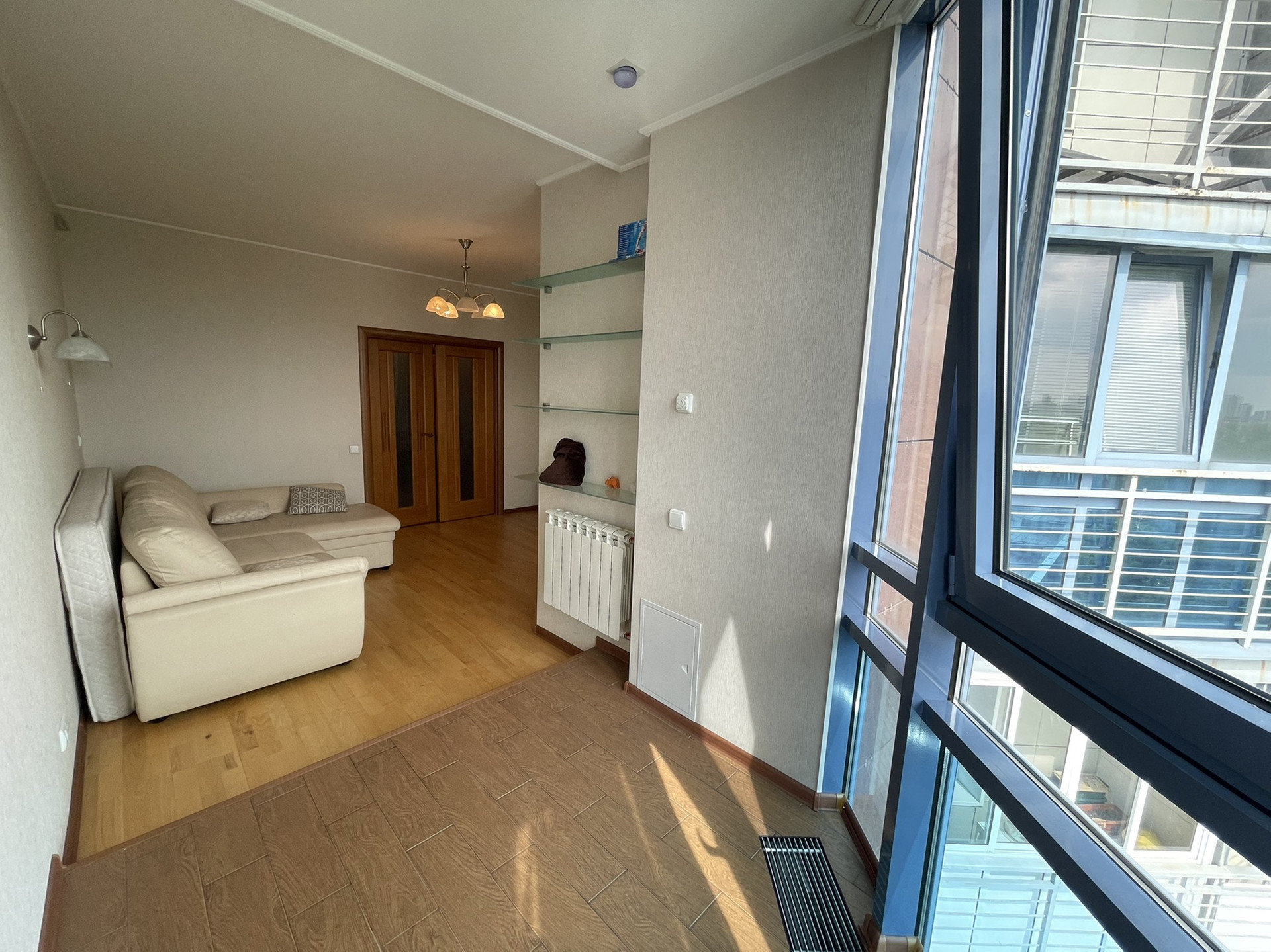 Главная фишка квартиры - панорамные окна, идущие прямо от потолка к полу, создают дополнительное пространство и свет. В гостиной у окна отдельный постамент, на котором можно уютно устроиться и наблюдать за панорамным видом 11-го этажа. Окна выходят на юг, в квартире много света.