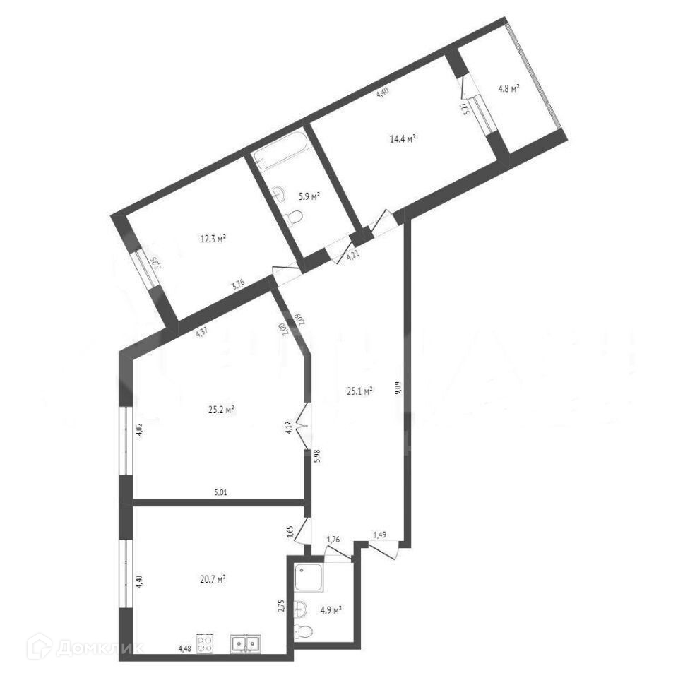 Общая площадь квартиры: 108,5м., кухня 20,7м., гостиная 25,2м., два сан. узла 4,9м., комната 12,3м., комната 14,4м., коридор 25,1 м. лоджия 4,8м.