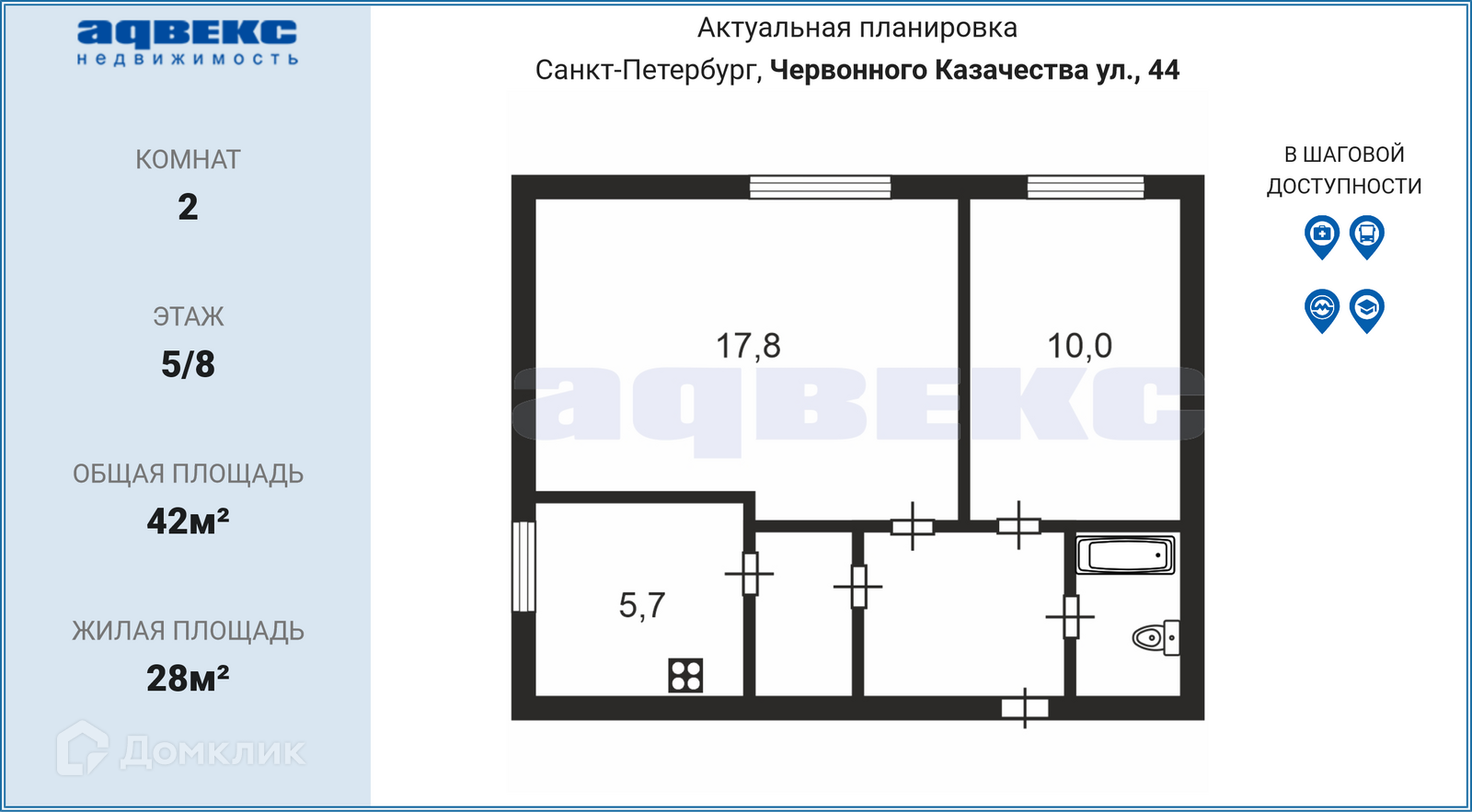 2-комнатная квартира, 42 м2, этаж 5 / 8, на продажу в Санкт-Петербурге, улица Червонного Казачества, 44