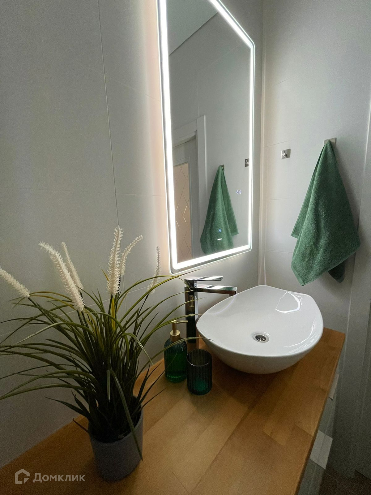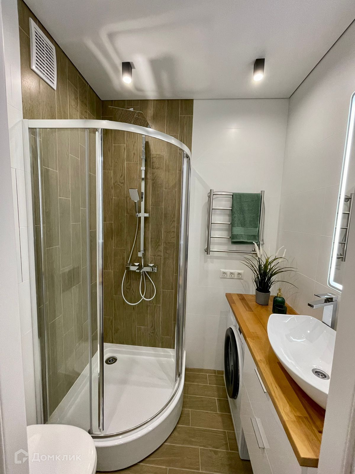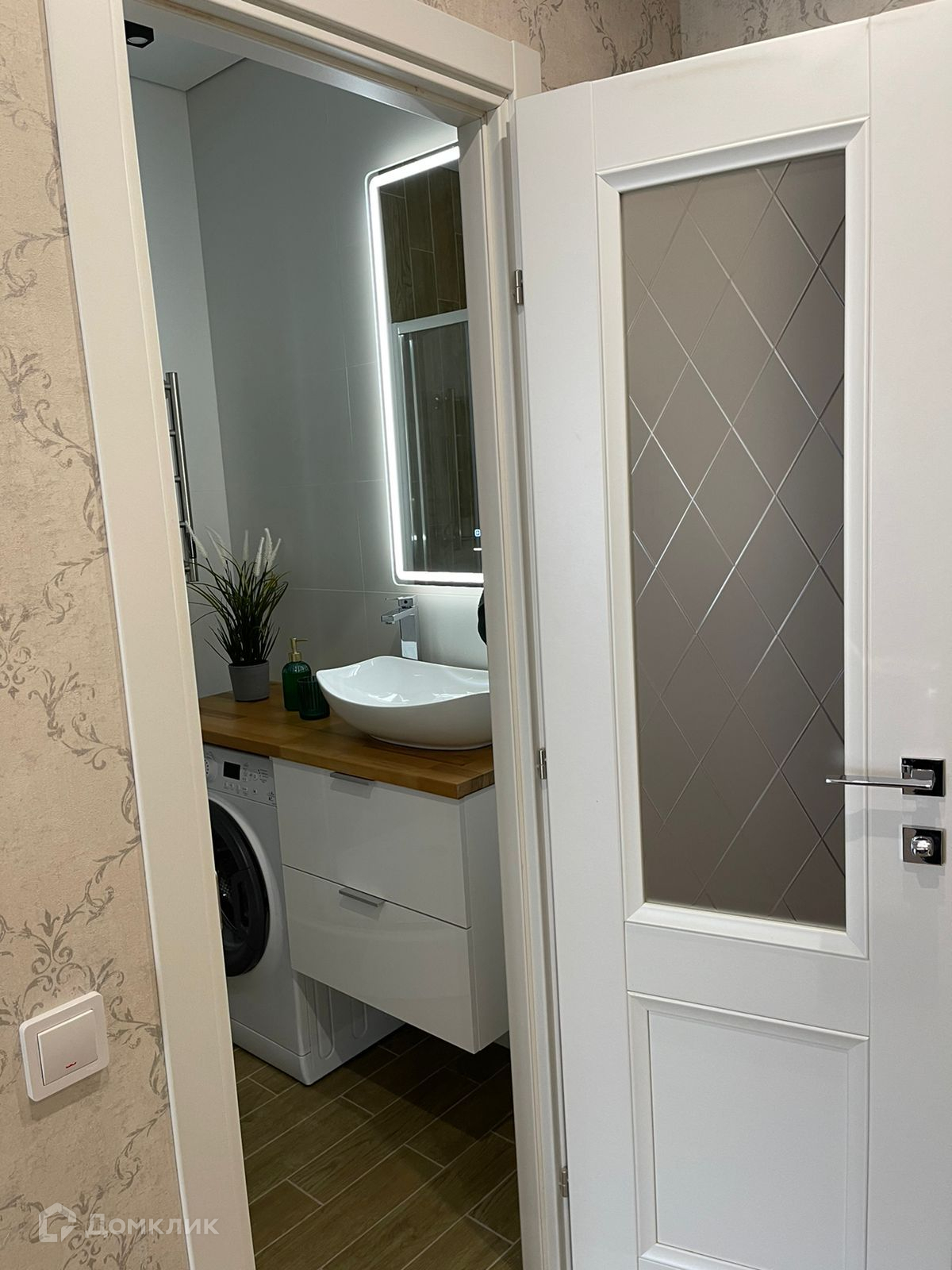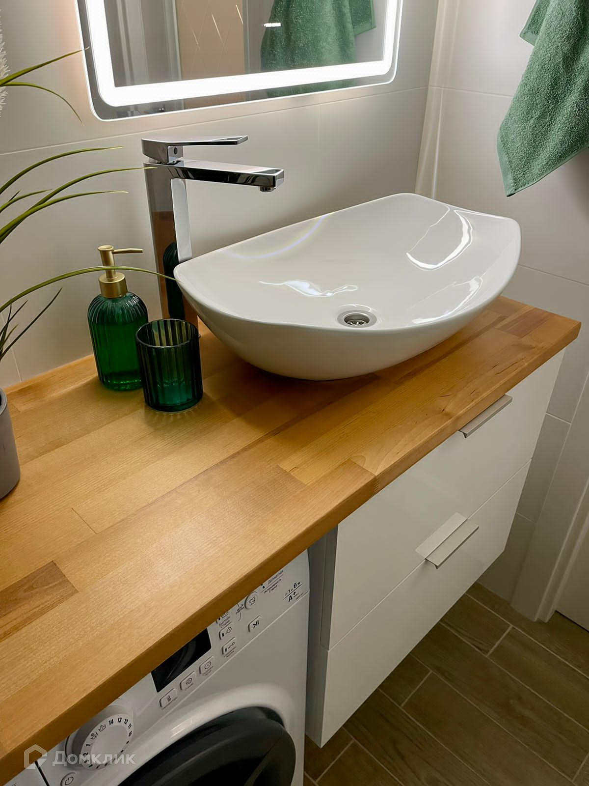 Всё в интерьере делалось для себя и комфортной жизни, что придаёт особую атмосферу уюта. В санузле много пространства для стиральной машины, зон хранения.