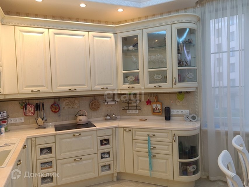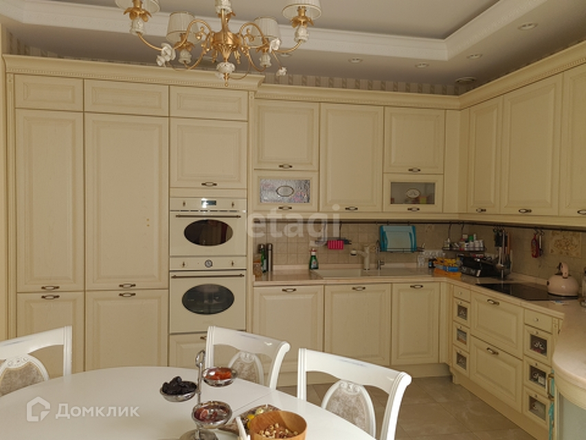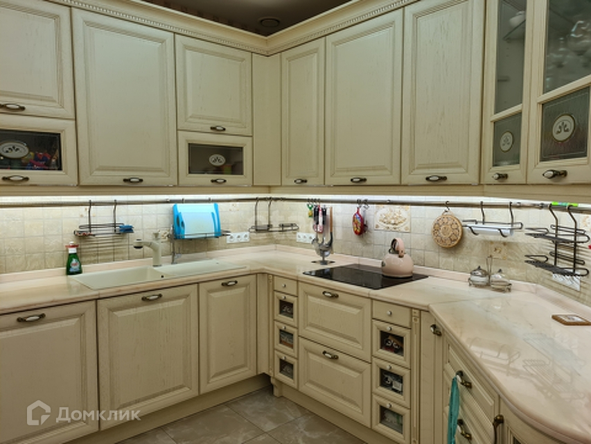 Кухонно–гостиная зона представляет собой большое пространство 57 кв. м, которое включает в себя саму кухню более 17 кв. м, с прекрасным светлым гарнитуром, столешницей из розового мрамора и встроенной техникой мировых производителей.