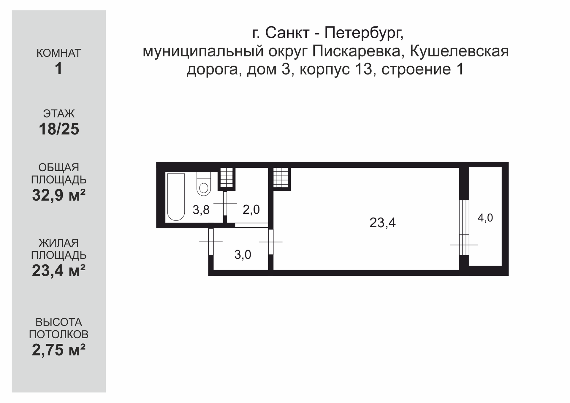 Квартира студия, 32.9 м2, этаж 18 / 25, на продажу в Санкт-Петербурге, Кушелевская дорога, 3к13