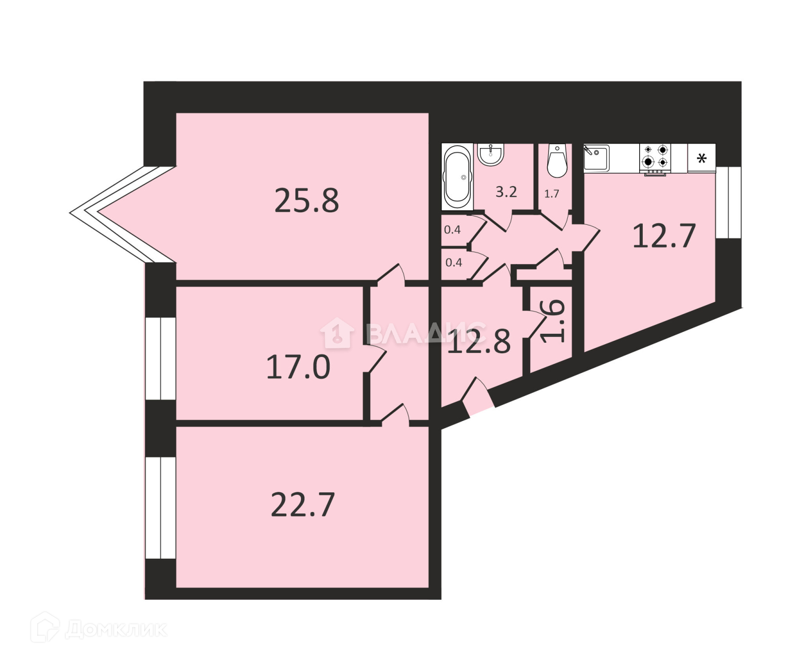 Комнаты - 25,8 +22,7 + 17 кв.м;