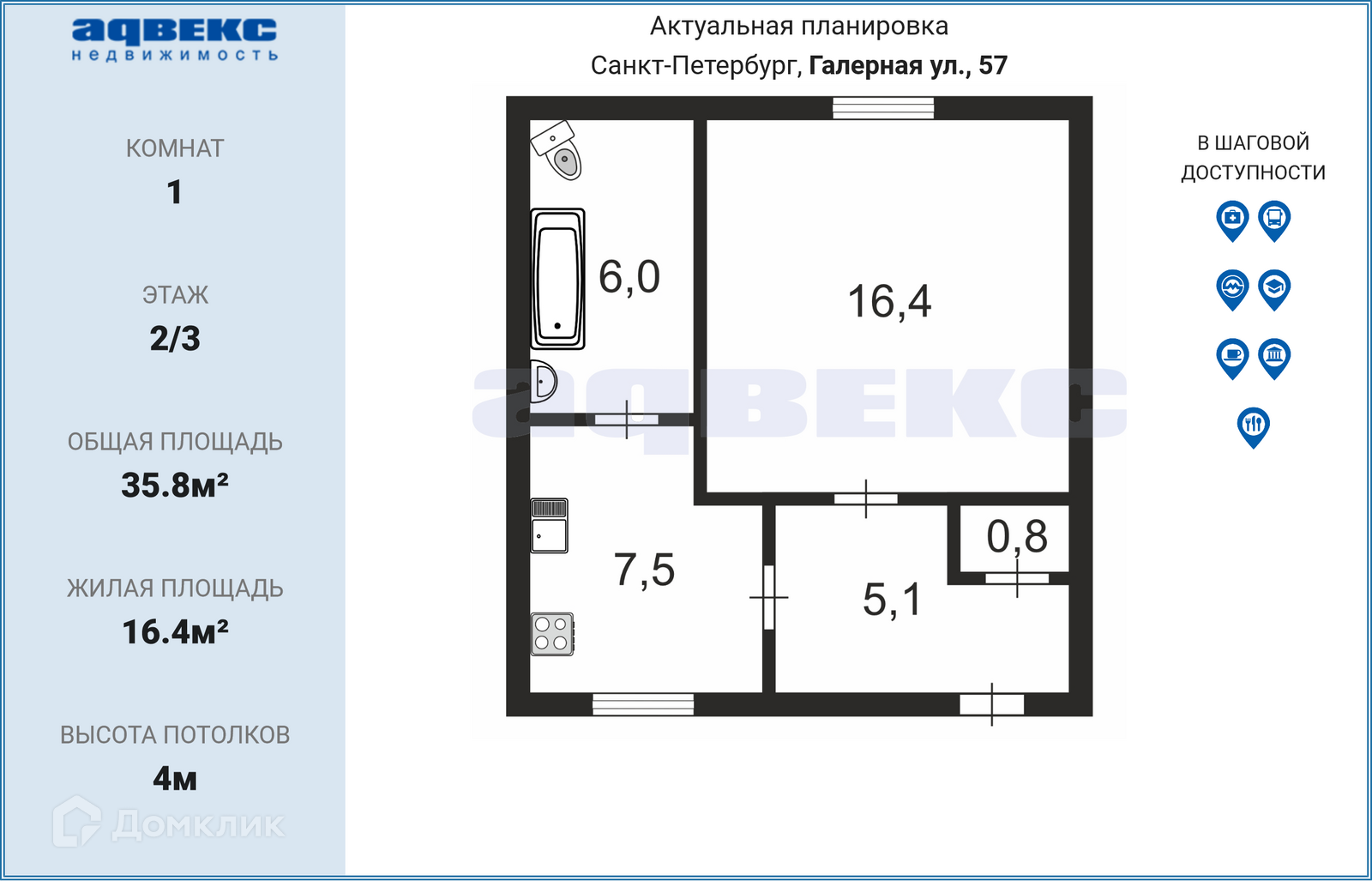 Общая площадь 35.8 м2