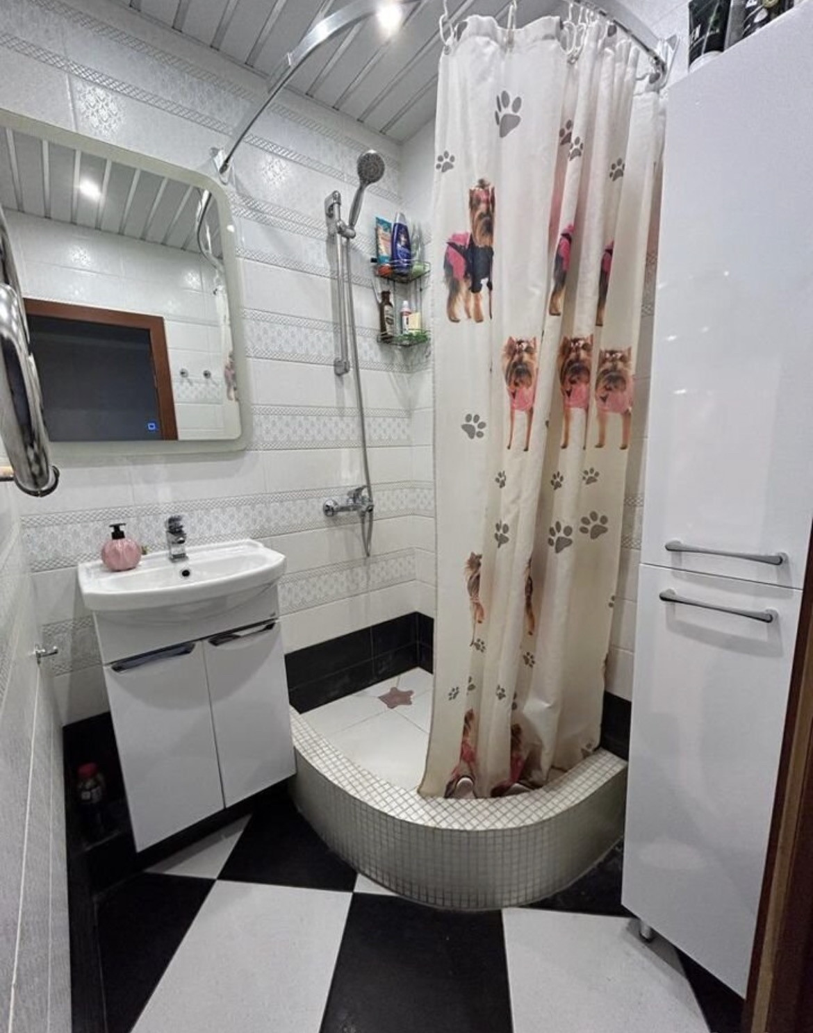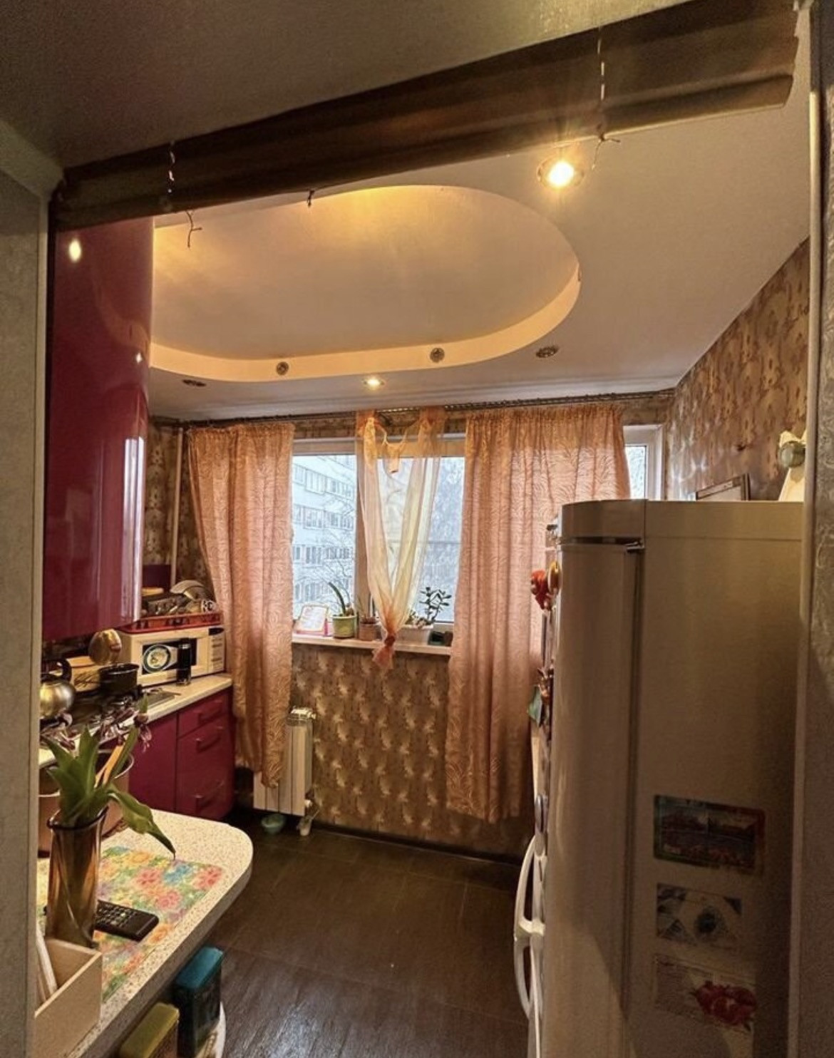 Потолки в комнатах натяжные глянцевые, на кухне- гипрок, полы- ламинат, в кухне- керамогранит, туалет и ванна- кафель.