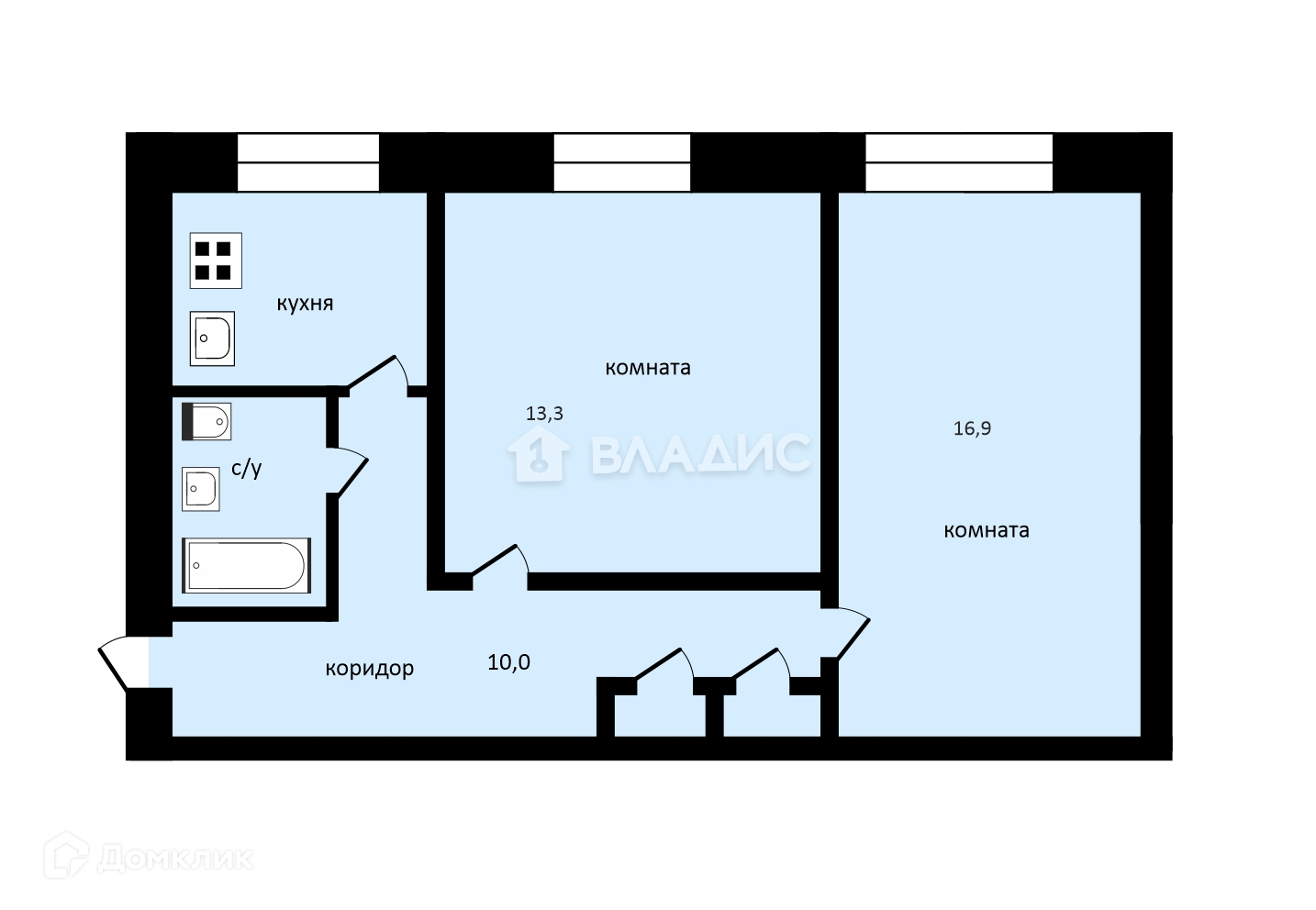 5) Комнаты правильной прямоугольной формы: 16,9 кв.м и 13,3 кв.м; кухня - 5,7 кв.м стандартной формы