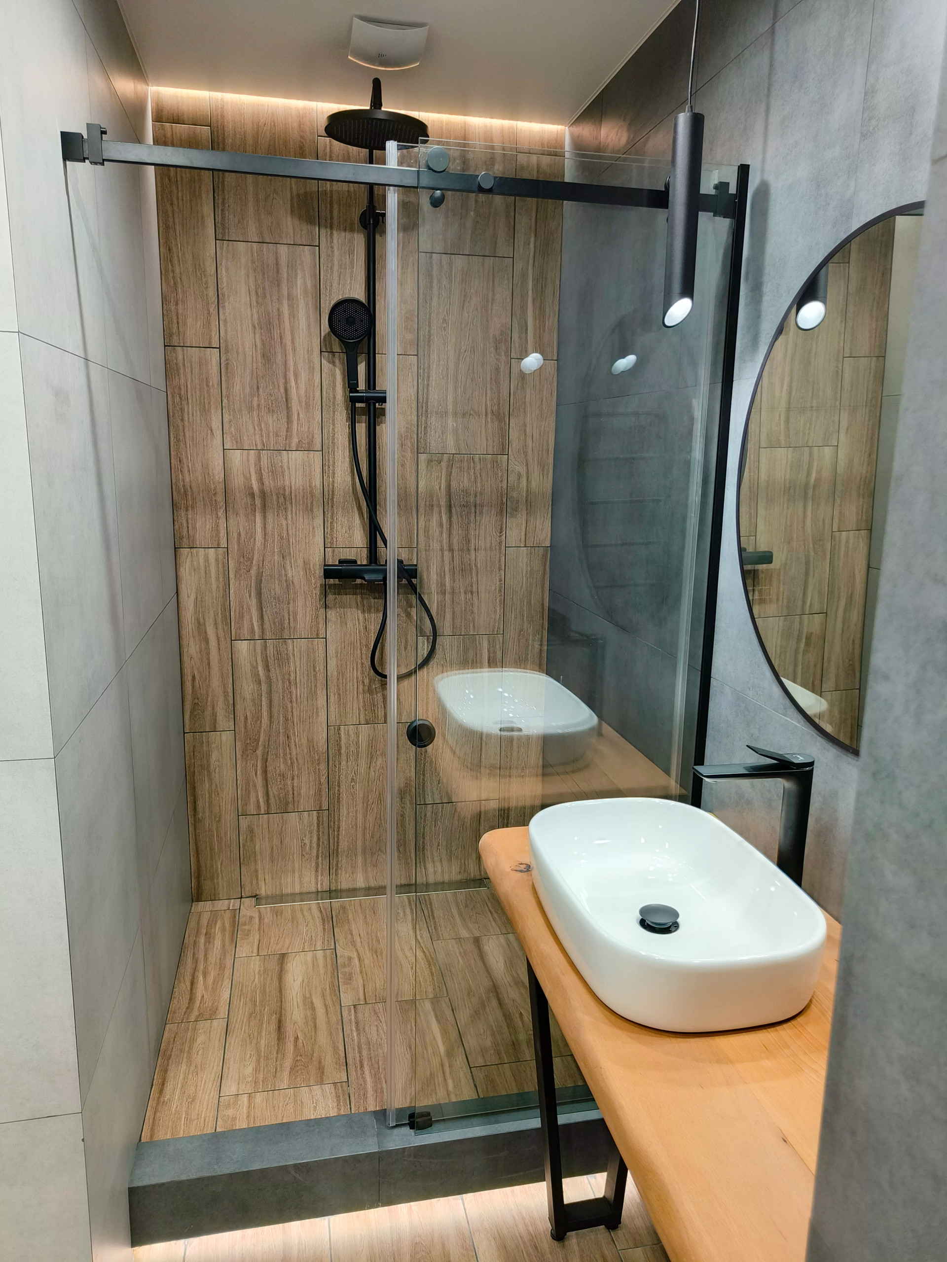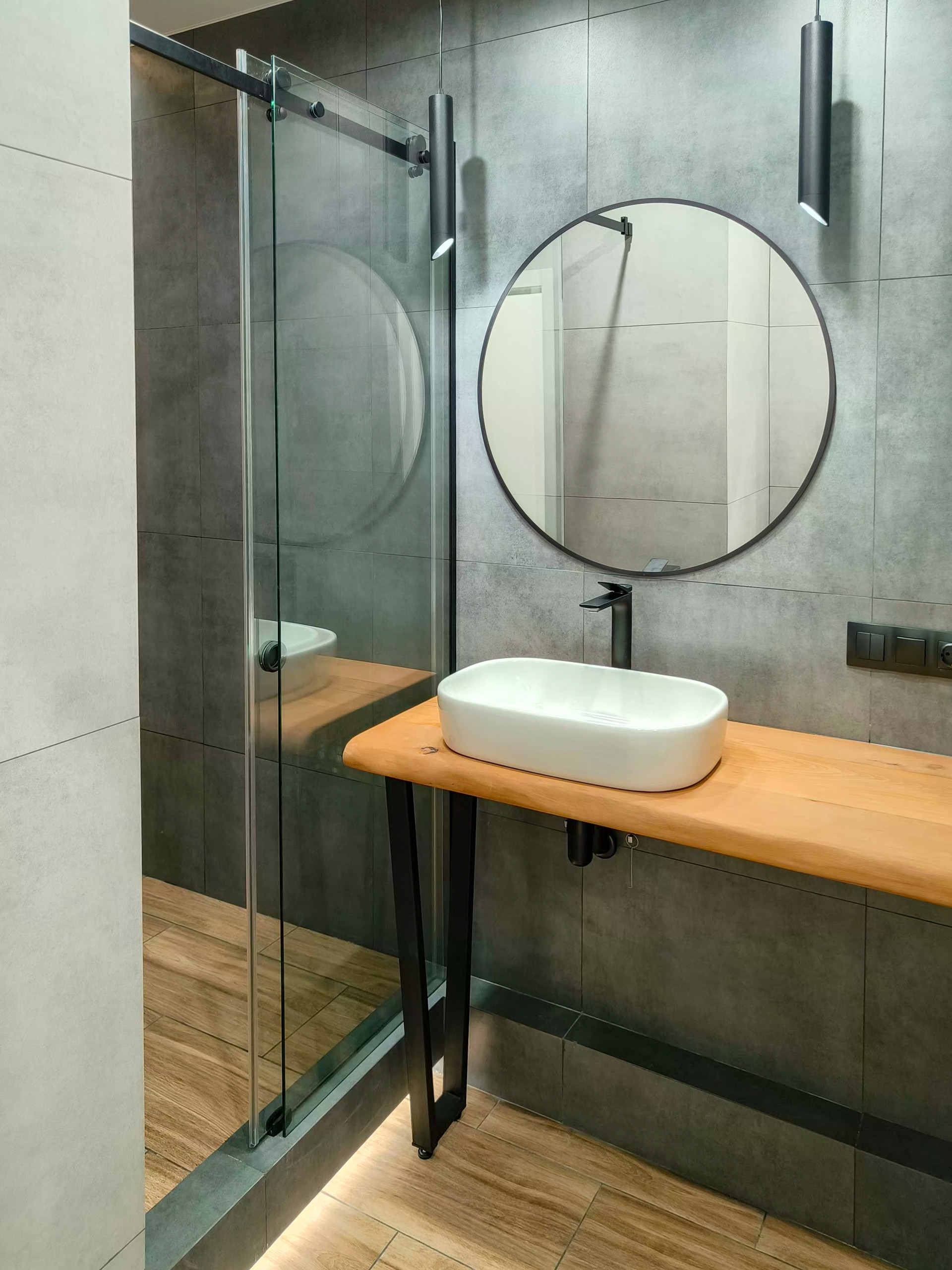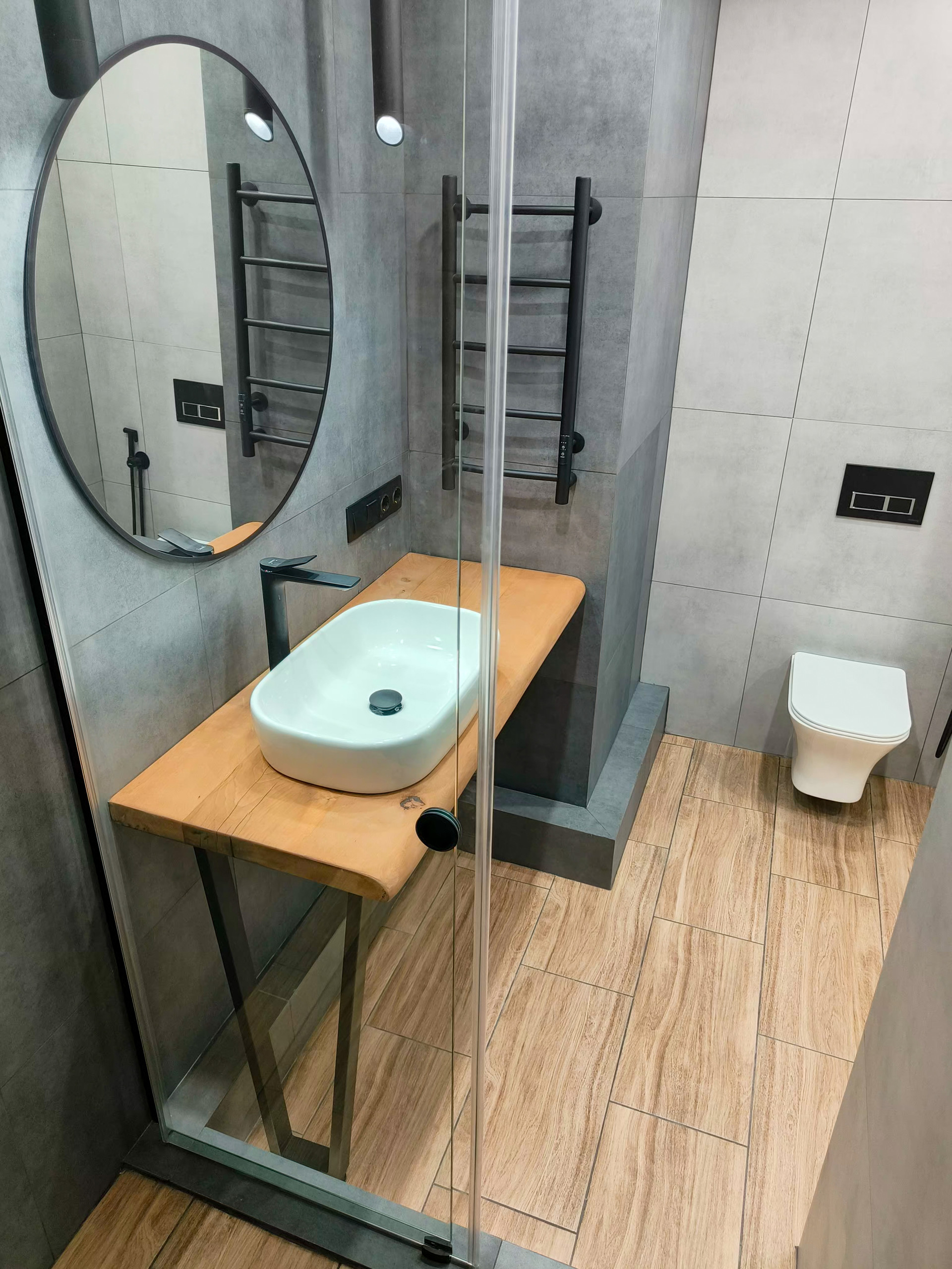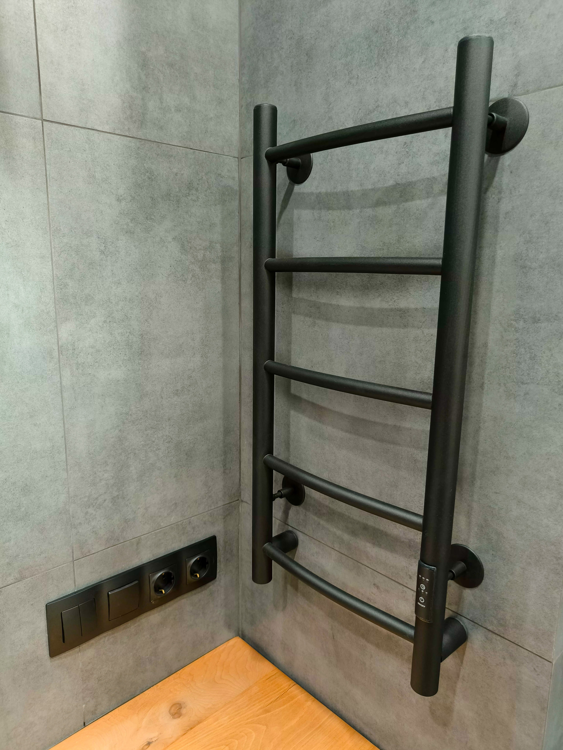 Душевая система для ванны с термостатом, который будет поддерживать комфортную температуру воды. Установлен современный электрополотенцесушитель с таймером.