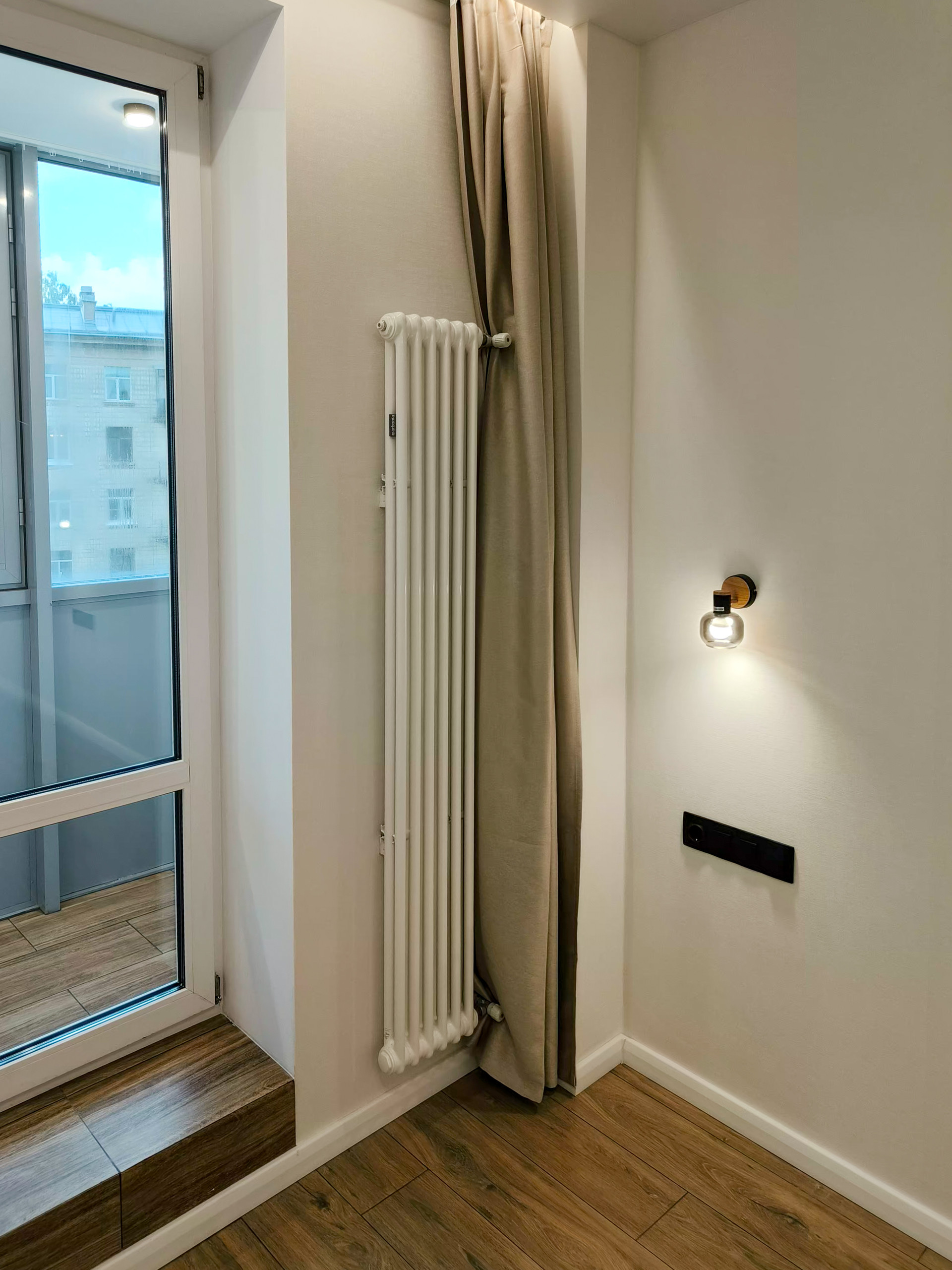 Оборудованы теплые полы в санузлах, на лоджии и в коридоре (что помогает быстро высушить обувь); для каждой зоны стоит отдельный терморегулятор.