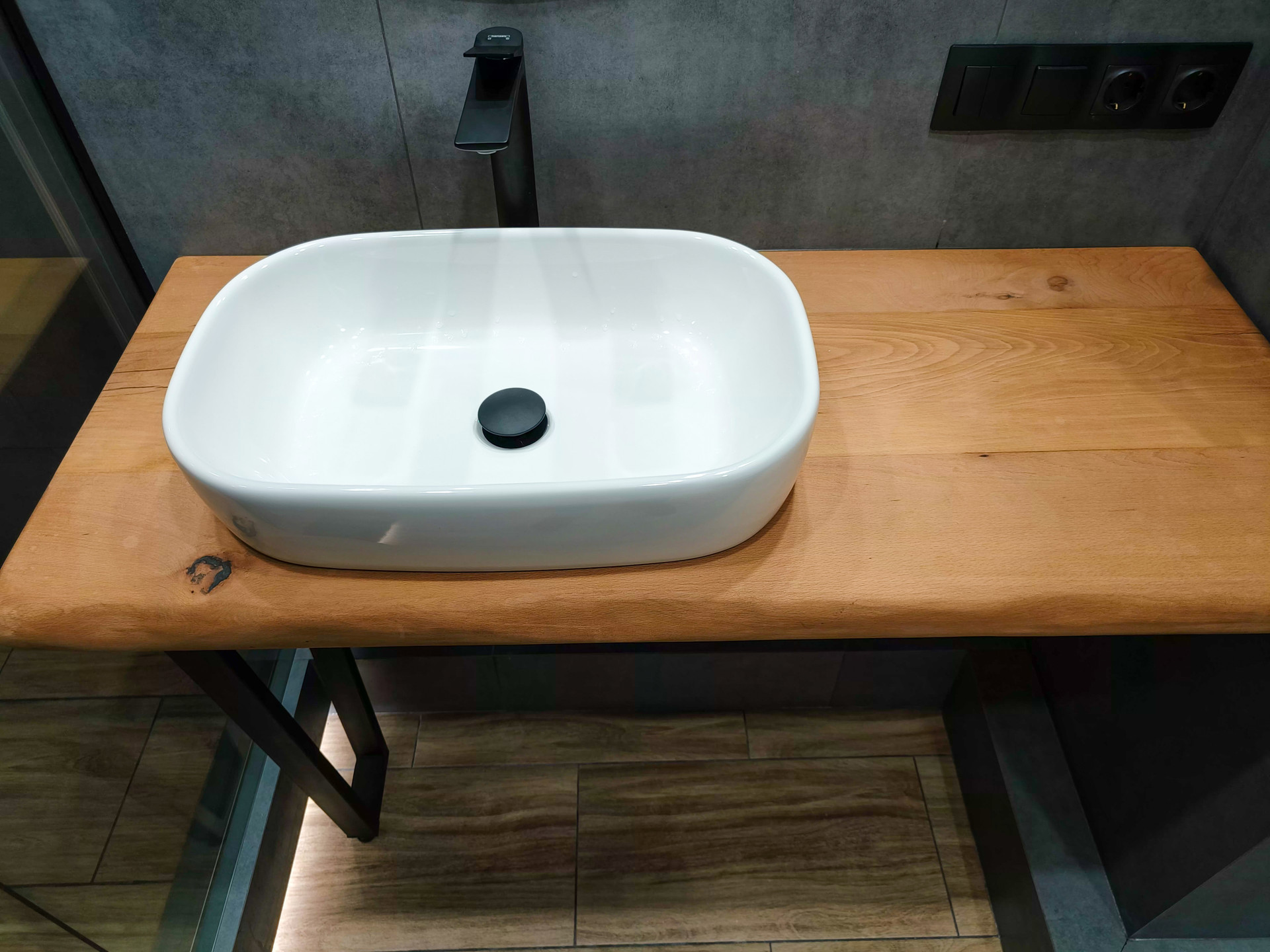 Столешница из массива дуба с зоной для стиральной машины в ванной.