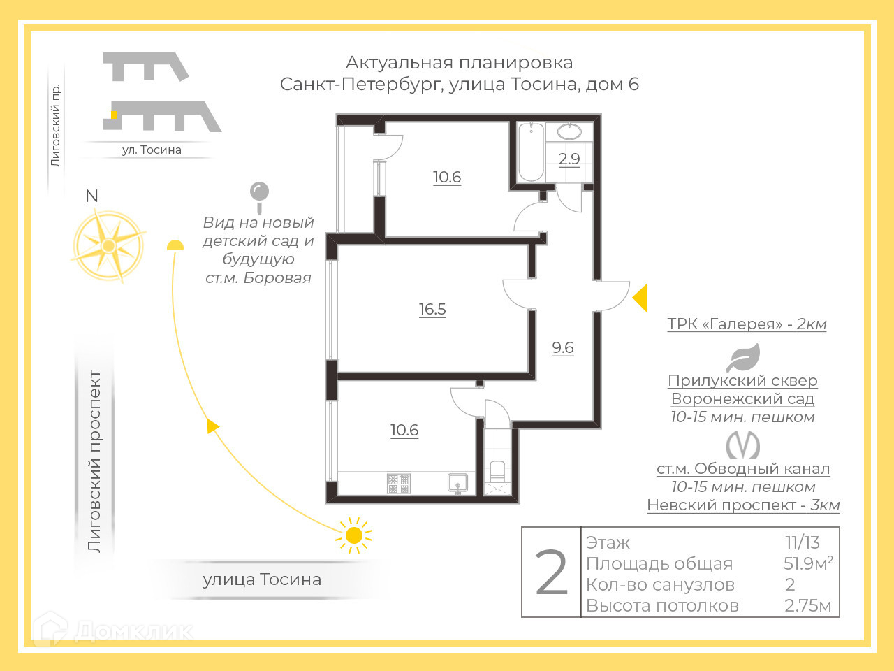 2-комнатная квартира, 50.3 м2, этаж 11 / 13, на продажу в Санкт-Петербурге, Тосина улица, 6