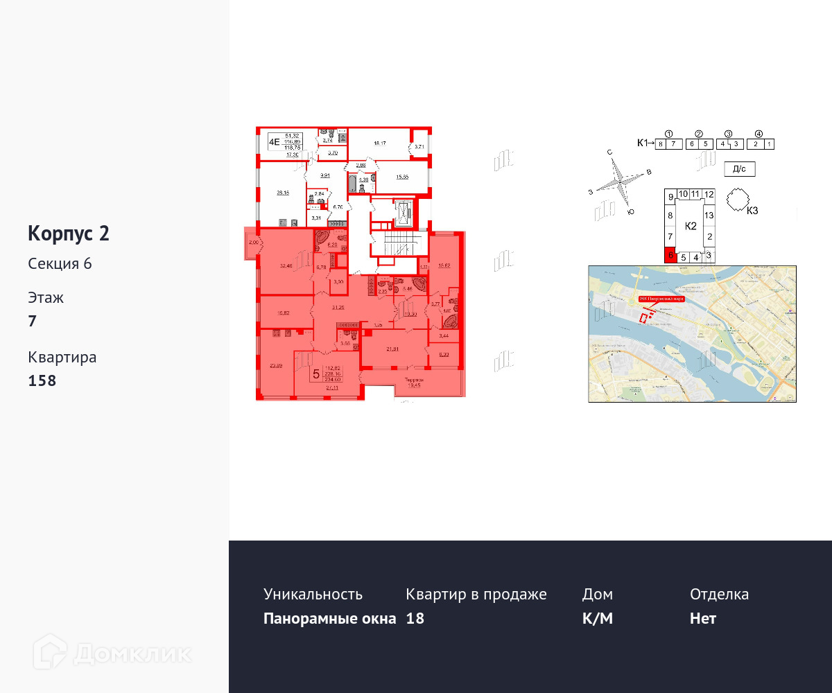 Продается пятикомнатная квартира в ЖК Петровский Квартал на воде площадью 230.1 м2 (жилая площадь – 108.58 м2). Квартира расположена рядом с метро Спортивная. Расстояние до метро 20 Мин.пешком. Площадь кухни 23.41 м2. Площадь прихожей 49.77 м2. Санузел – пять санузлов. Балкон + 2 лоджии. Без отделки.