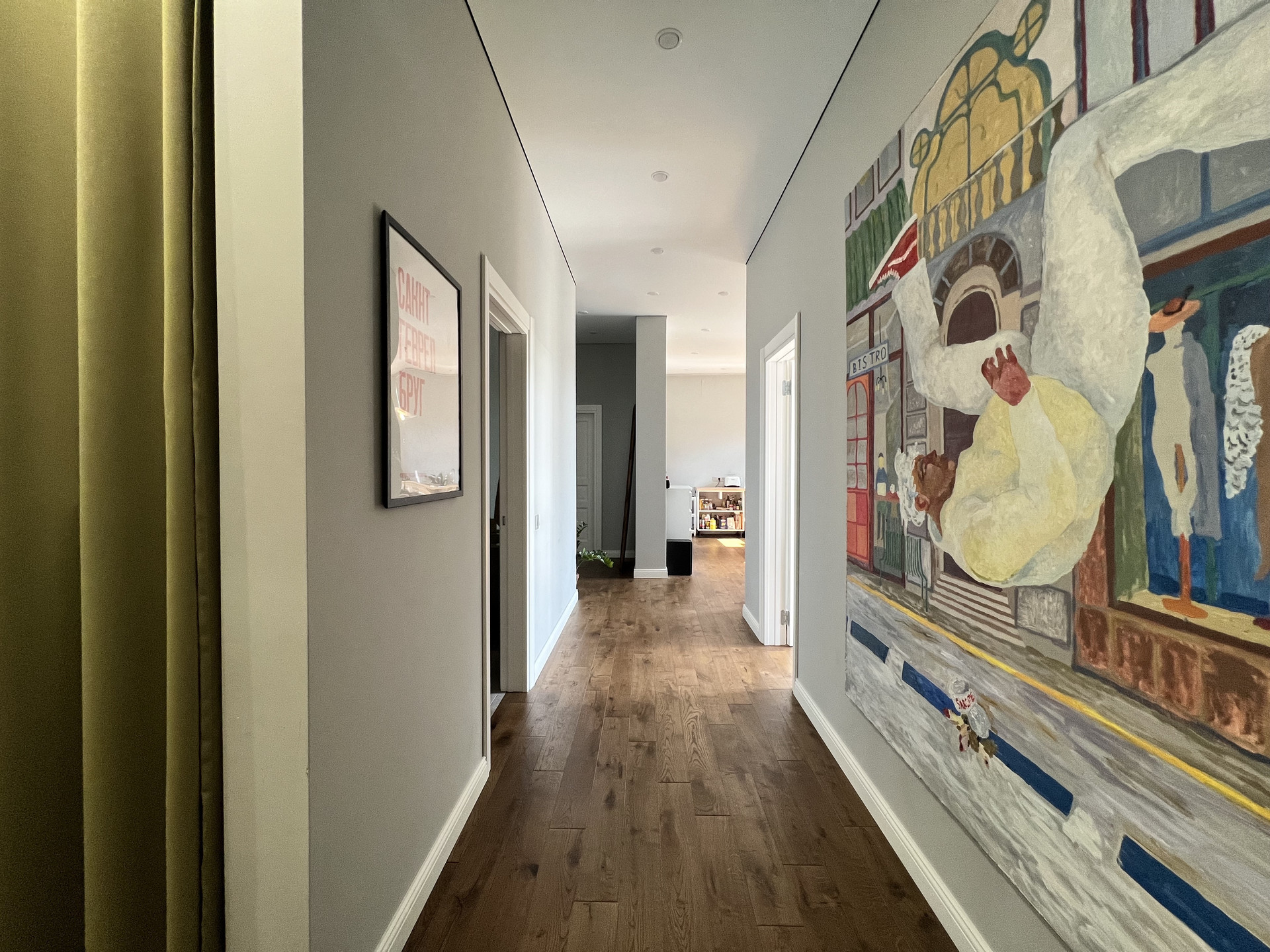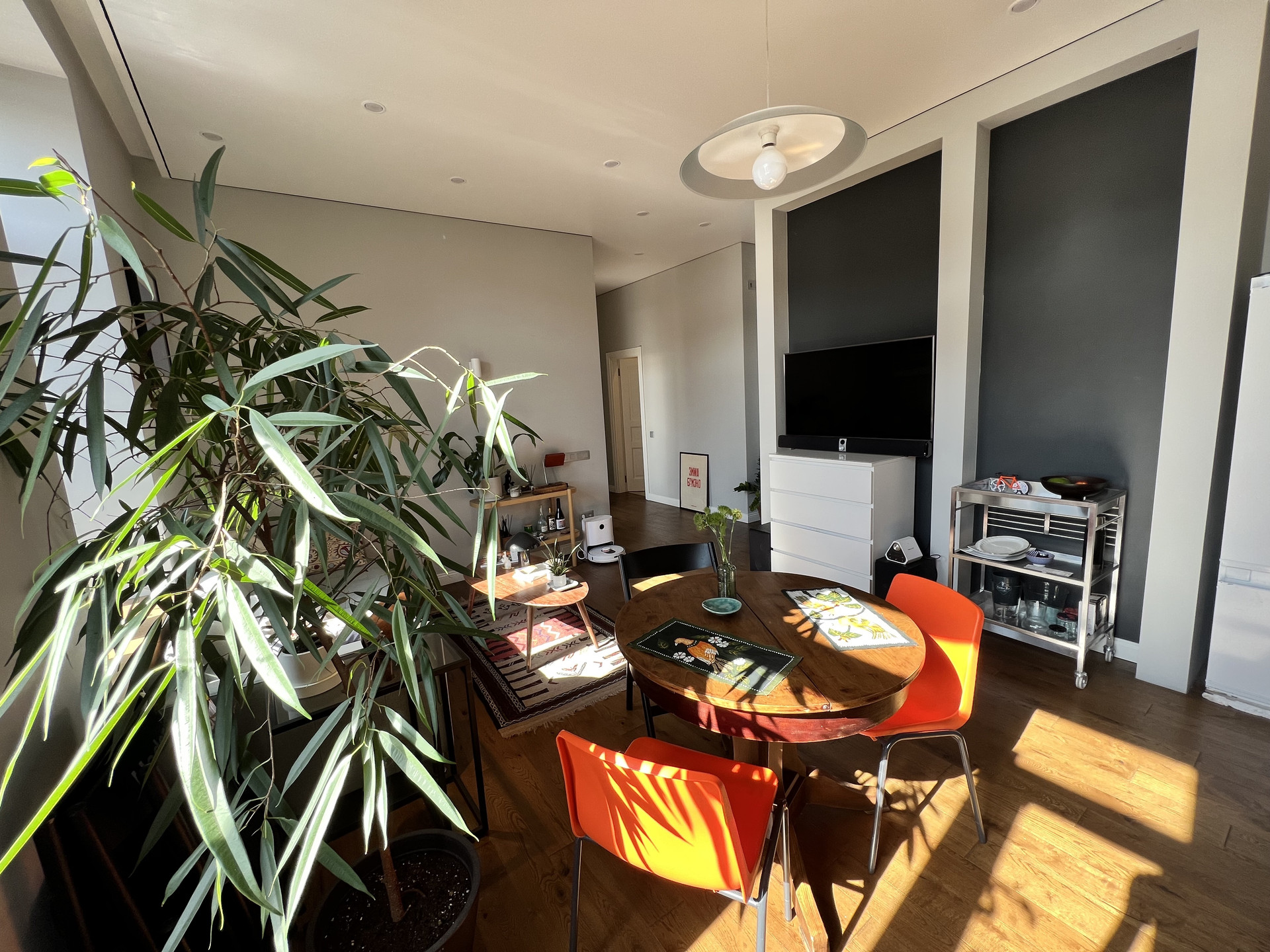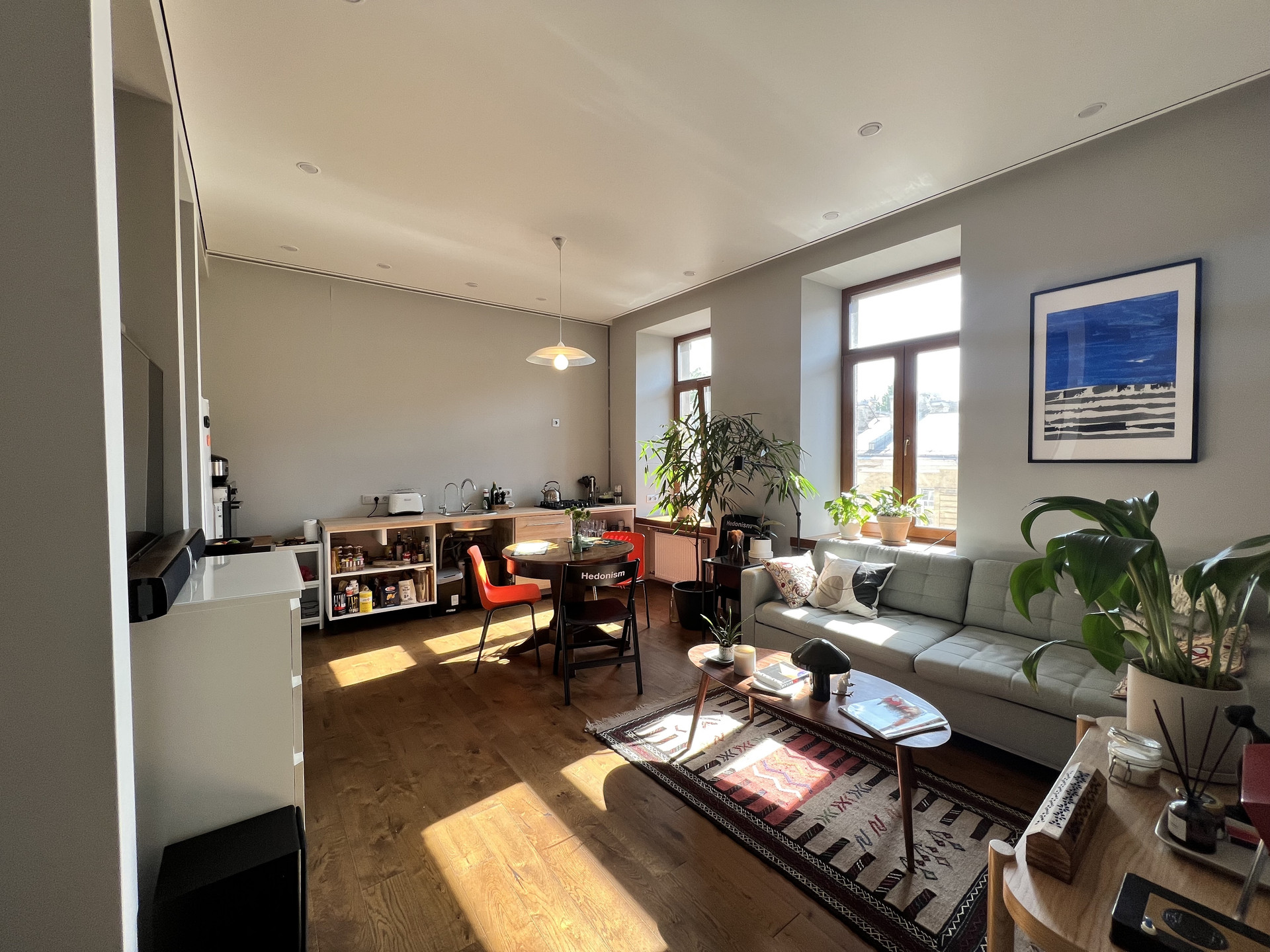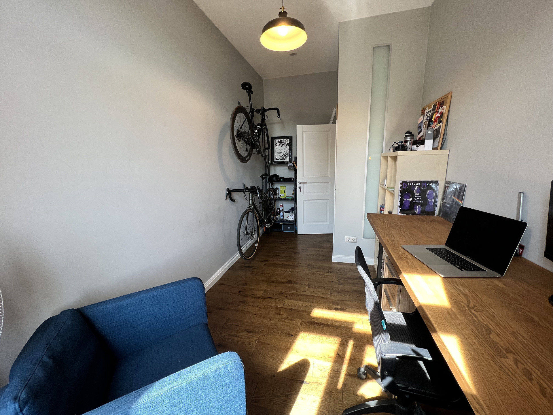 просторная кухня-гостиная, спальня, рабочий кабинет, холл, гардеробная, раздельный санузел. Высокие окна выходят на юго-восток. Высота потолка более 3 метров. Большая часть мебели остаётся новому собственнику.