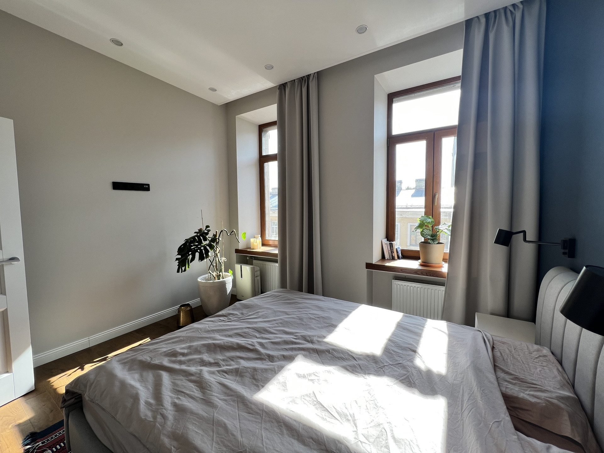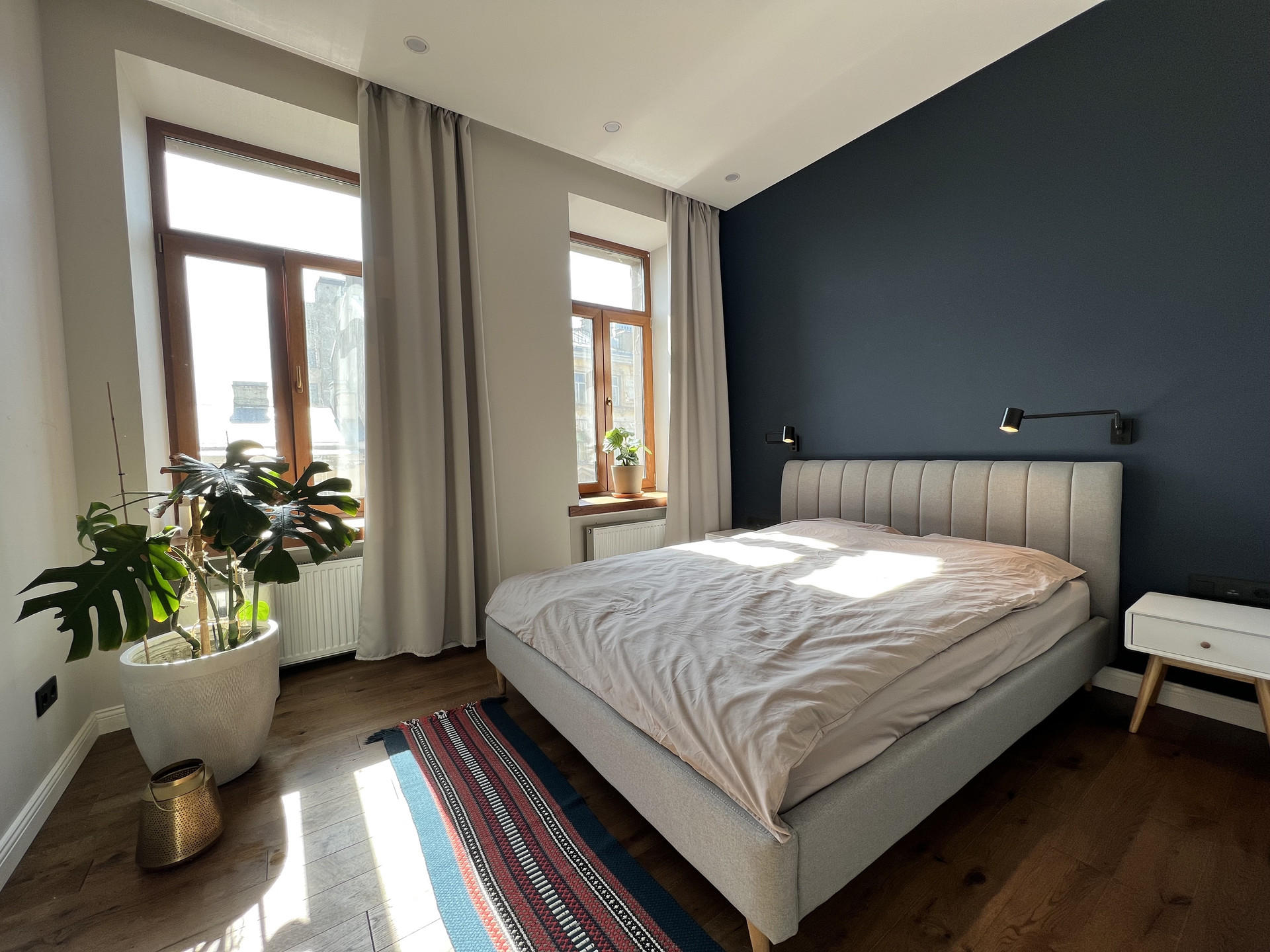 В отделке использованы только высококачественные материалы, мебель и техника. Пол, подоконники из натурального дуба, в с/у инсталляция из цельного мрамора. Ванна и раковина Villeroy & Boch, краны Sturm, краска Benjamin Moore.