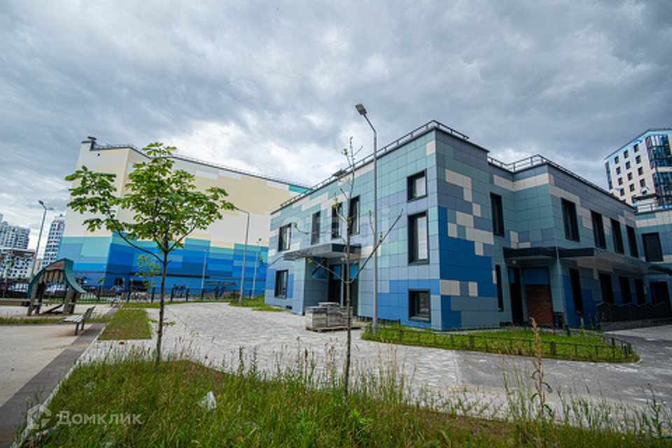 Закрытый двор без машин с современными детскими площадками и детским садиком в пешей доступности.