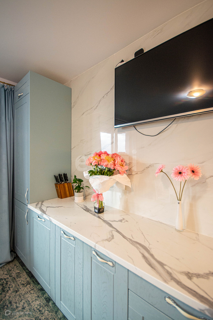 Кухня: стены - керамогранит, встроенные посудомойка, холодильник, духовка.
