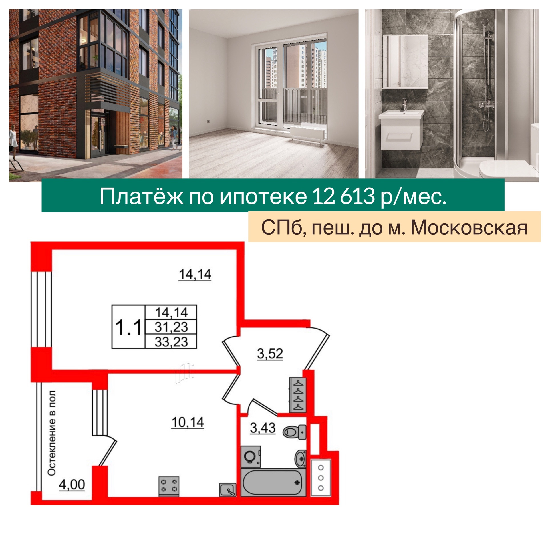 1-комнатная квартира, 31.23 м2, этаж 3 / 12, на продажу в Санкт-Петербурге, Кубинская улица, 76к4литА