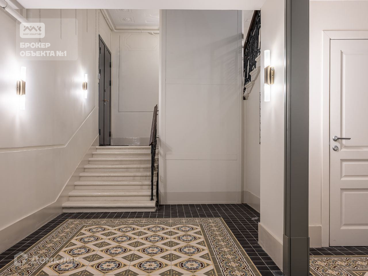Отреставрированная красивая парадная с деликатной лепниной, современный лифт .