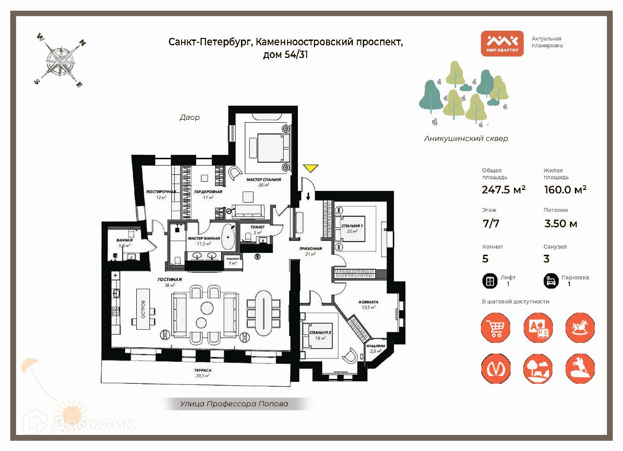 3 изолированные спальни: 20м, 18м, и мастер спальня 30м со своей зоной отдыха, гардеробной с окном 11м и приватным санузлом с ванной и душевой 12м, кабинет 15м, прихожую 21м, рабочая кухня / постирочная с окном 12м и ещё 2 санузла.