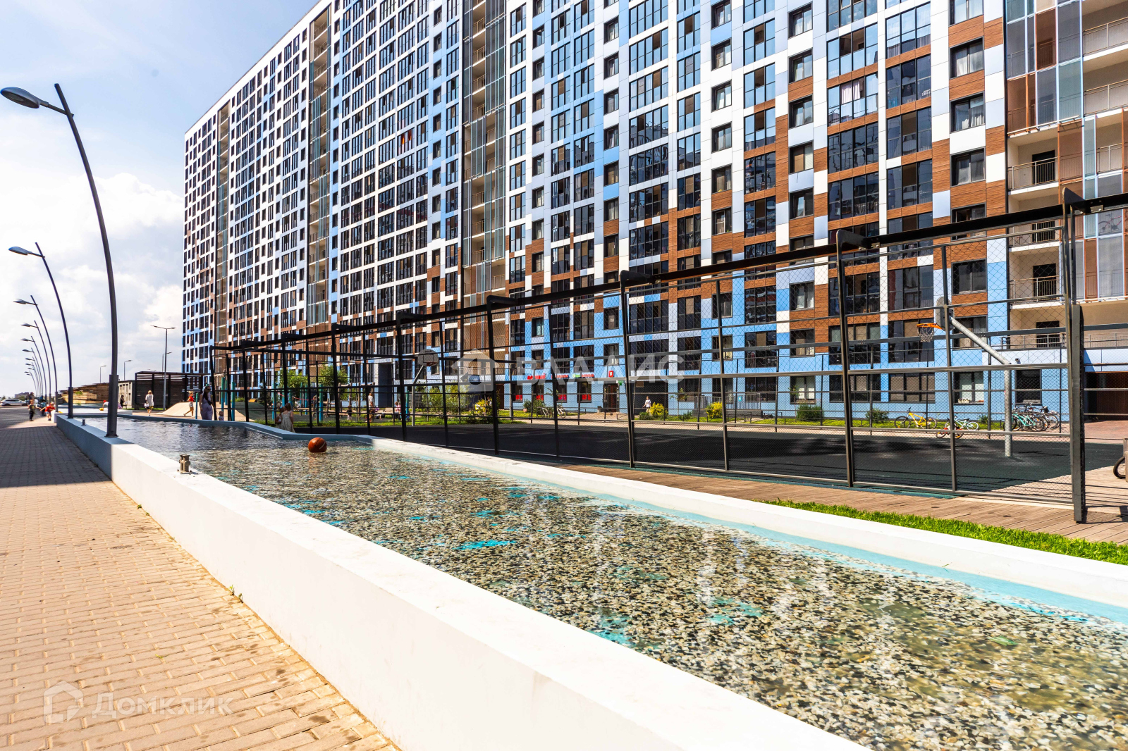 Во дворе детская и спортивная площадки, пешеходные дорожки, до берега 5 минут пешком.