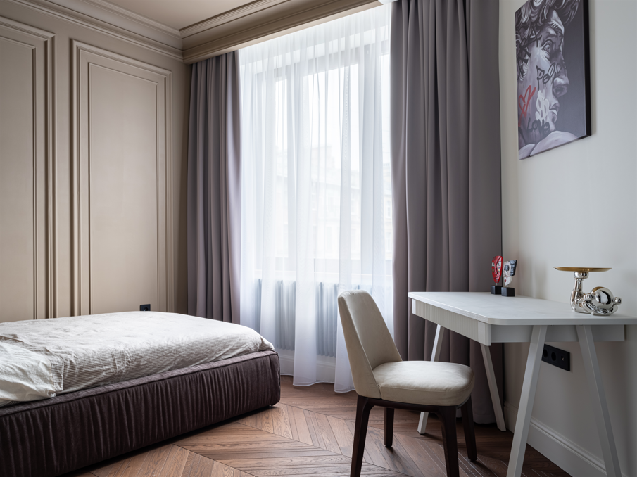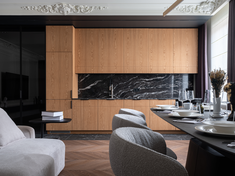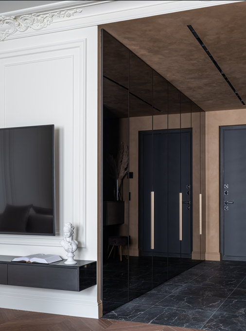 Дизайнерский проект от студии Status-home. Дизайн квартиры можно определить одним словом - вневременной, будет актуален ещё много лет . Дерево / мрамор/ гипсовая лепнина/ черное стекло/ декоративная штукатурка - все подобрано со вкусом и безупречно сочетается. 3ккв с двумя спальными комнатами и просторной кухней гостиной. Продуманная планировка, большое кол-во окон, вместительная гардеробная, зона отдыха в спальне.