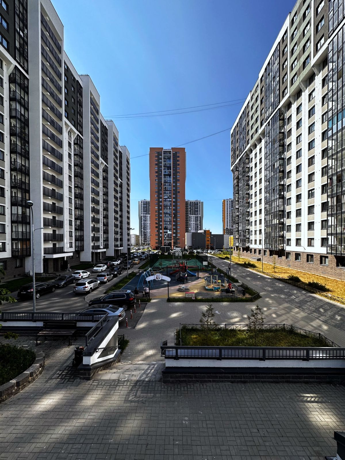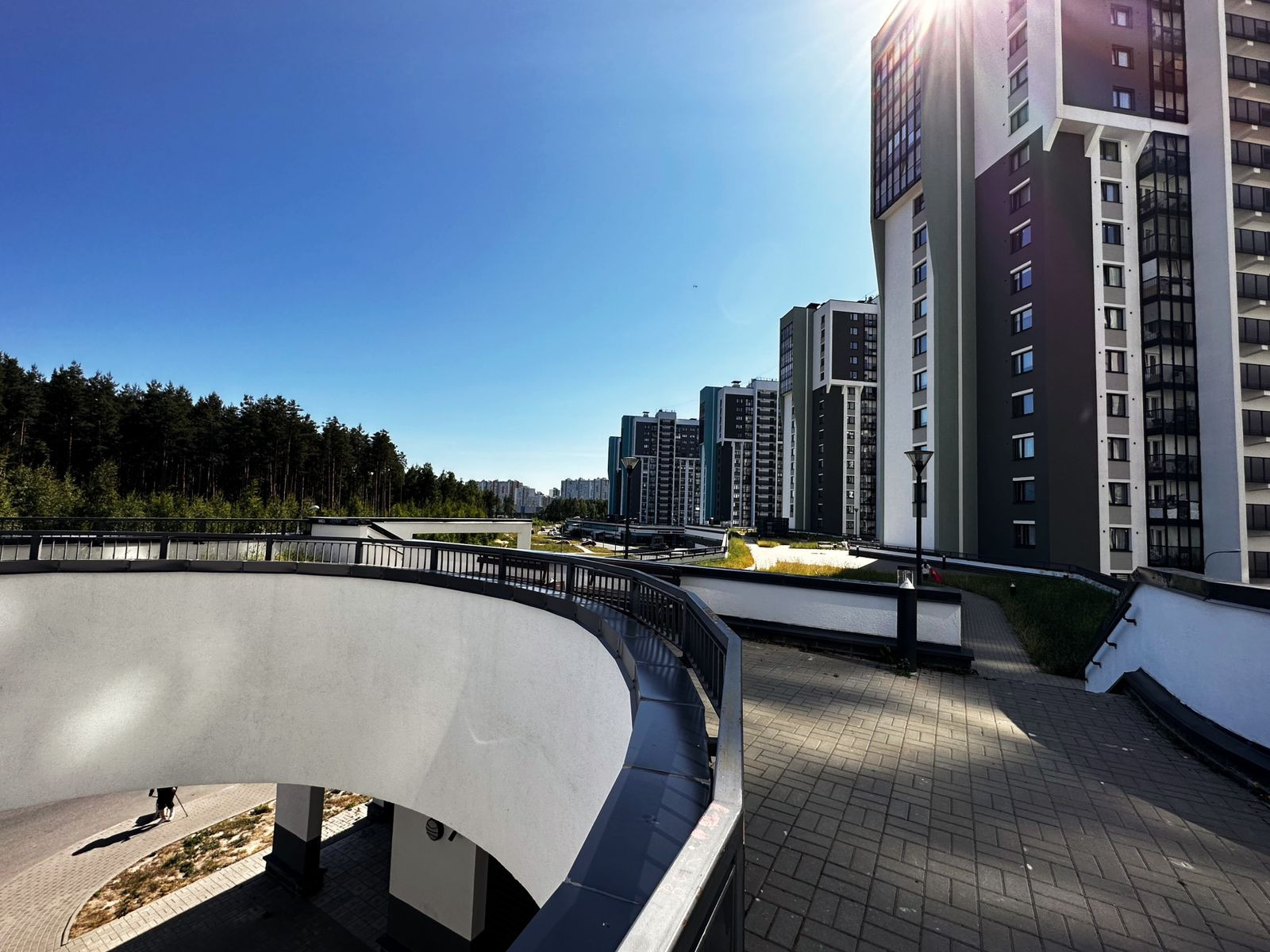 Прогулочный променад и зоны отдыха на втором ярусе двора.
