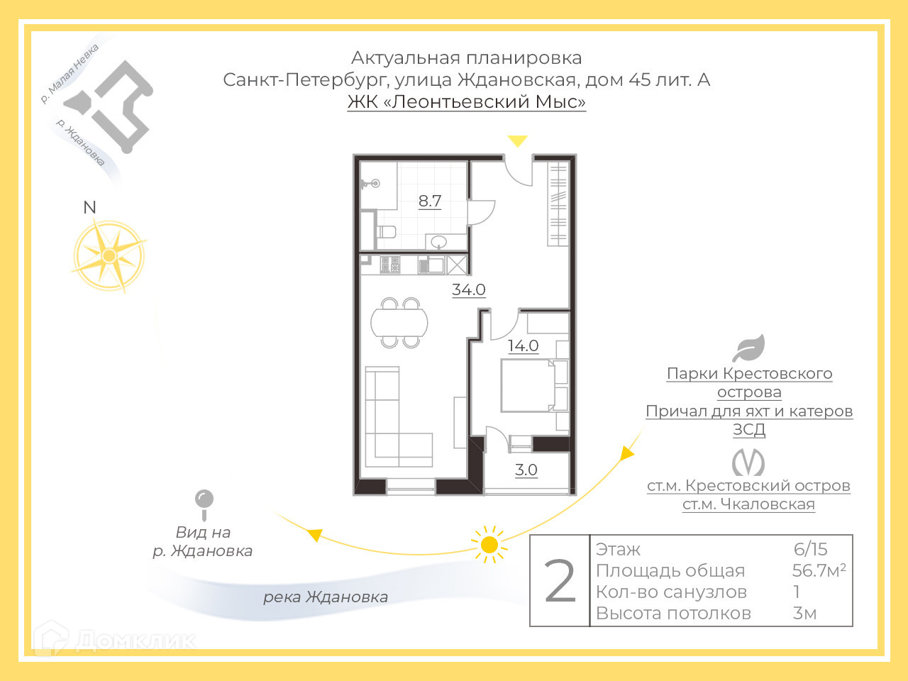 1-комнатная квартира, 56.7 м2, этаж 6 / 15, на продажу в Санкт-Петербурге, Ждановская улица, 45