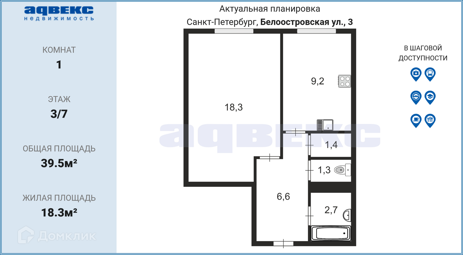1-комнатная квартира, 39.5 м2, этаж 3 / 7, на продажу в Санкт-Петербурге, Белоостровская улица, 3