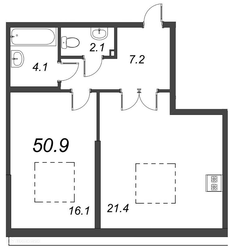 Общая площадь 50.9 м2