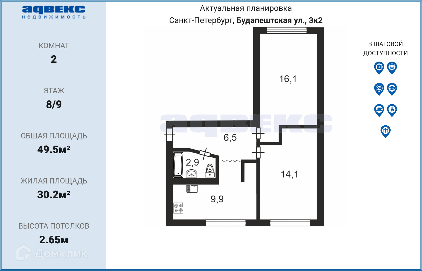 2-комнатная квартира, 49.5 м2, этаж 8 / 9, на продажу в Санкт-Петербурге, Будапештская улица, 3к2