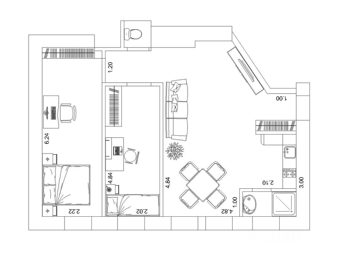 Общая площадь 54 м2