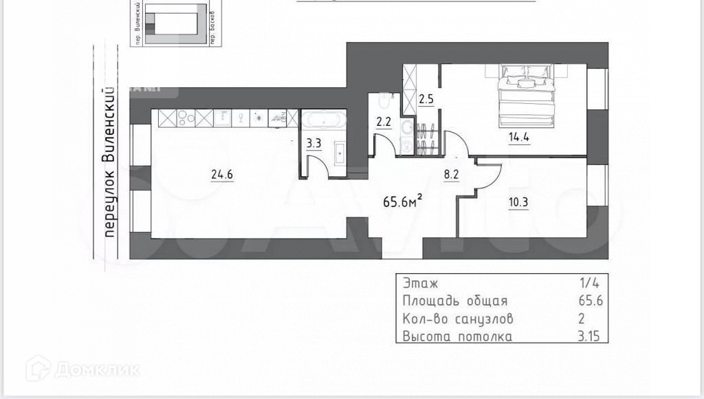2-комнатная квартира, 65.6 м2, этаж 1 / 5, на продажу в Санкт-Петербурге, Виленский переулок, 5