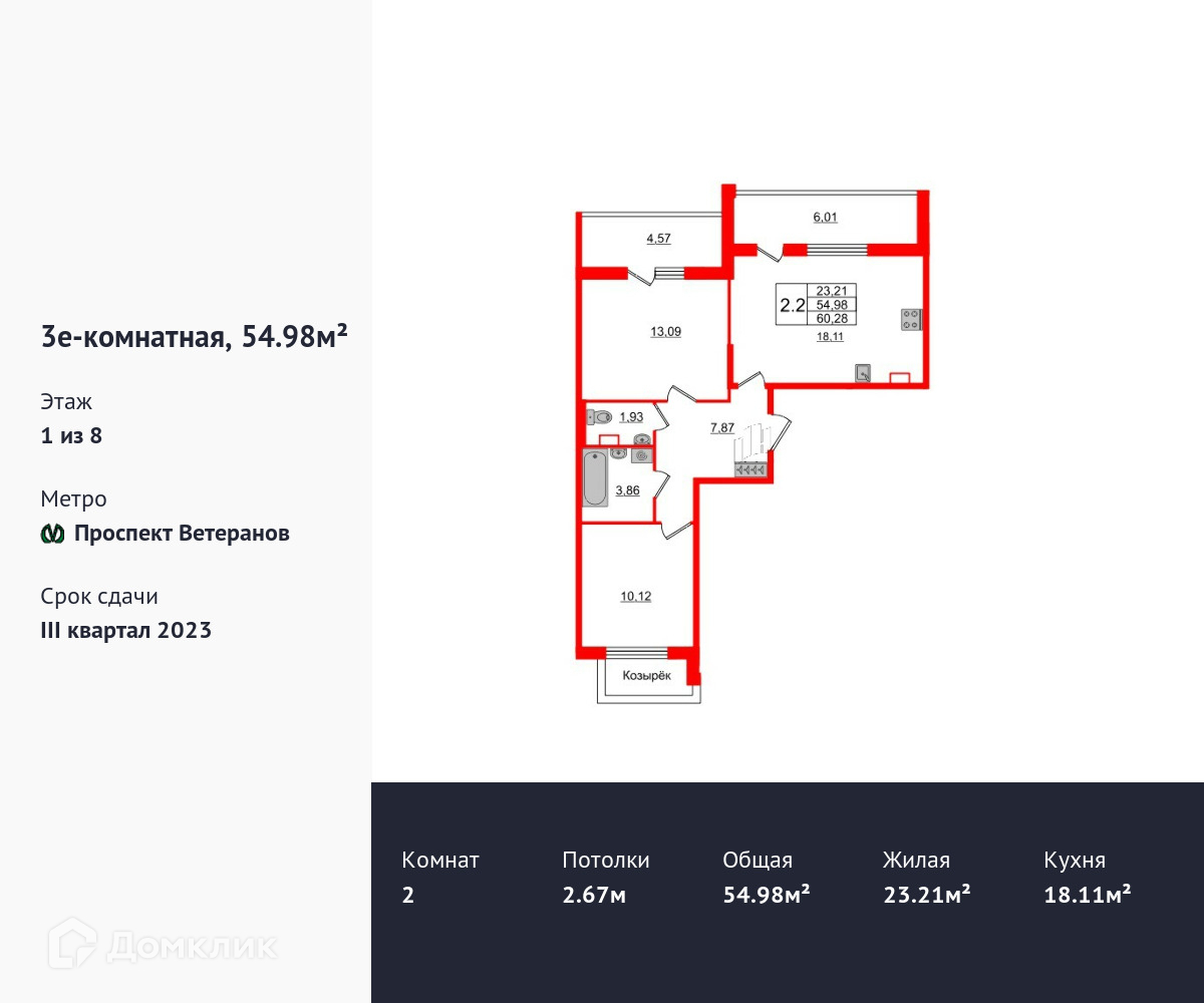 Продается двухкомнатная квартира в ЖК Солнечный город площадью 54.6 м2 (жилая площадь – 23.21 м2). Квартира расположена рядом с метро Проспект Ветеранов. Расстояние до метро 15 Мин.на транспорте. Площадь кухни 18.11 м2. Площадь прихожей 7.87 м2. Высота потолка 2.67 м. Две лоджии. Чистовая отделка.