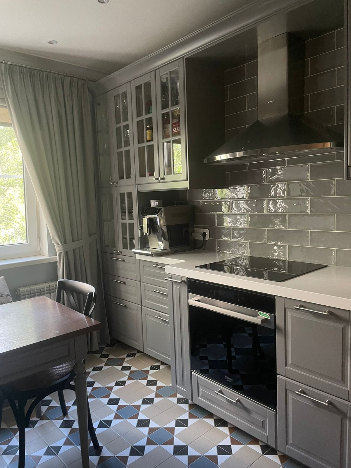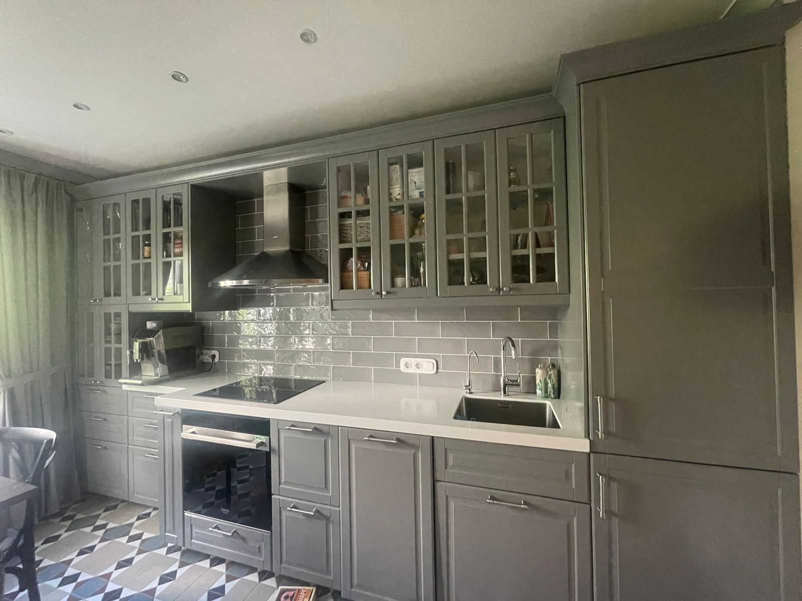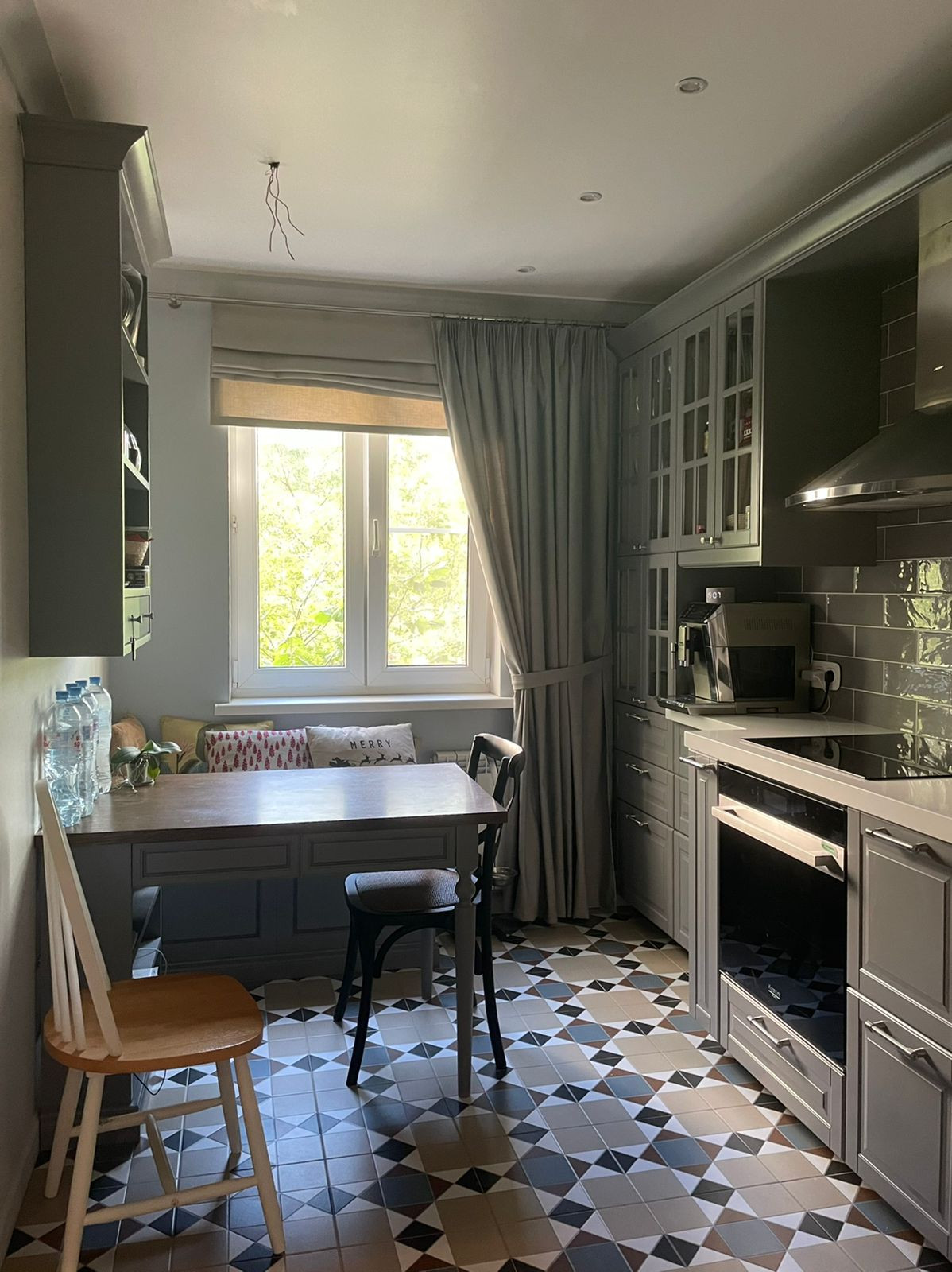 Кухня: итальянская плитка, кухня икея фасады, столешница камень, мебель на заказ: стол с натуральным деревом, мдф консоль и кушетка. Увеличенный встроенный холодильник Вирпул, духовка Аристон, плита Бош, посудомойка Бош. Фильтр Гейзер. Бойлер на 30 литров, Раковина Бланко.