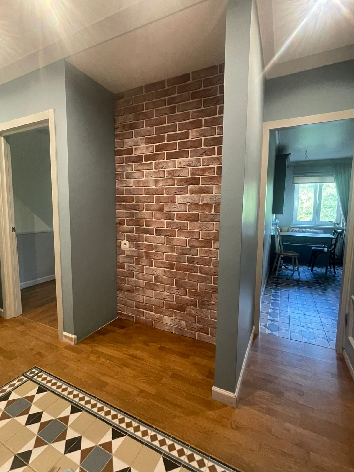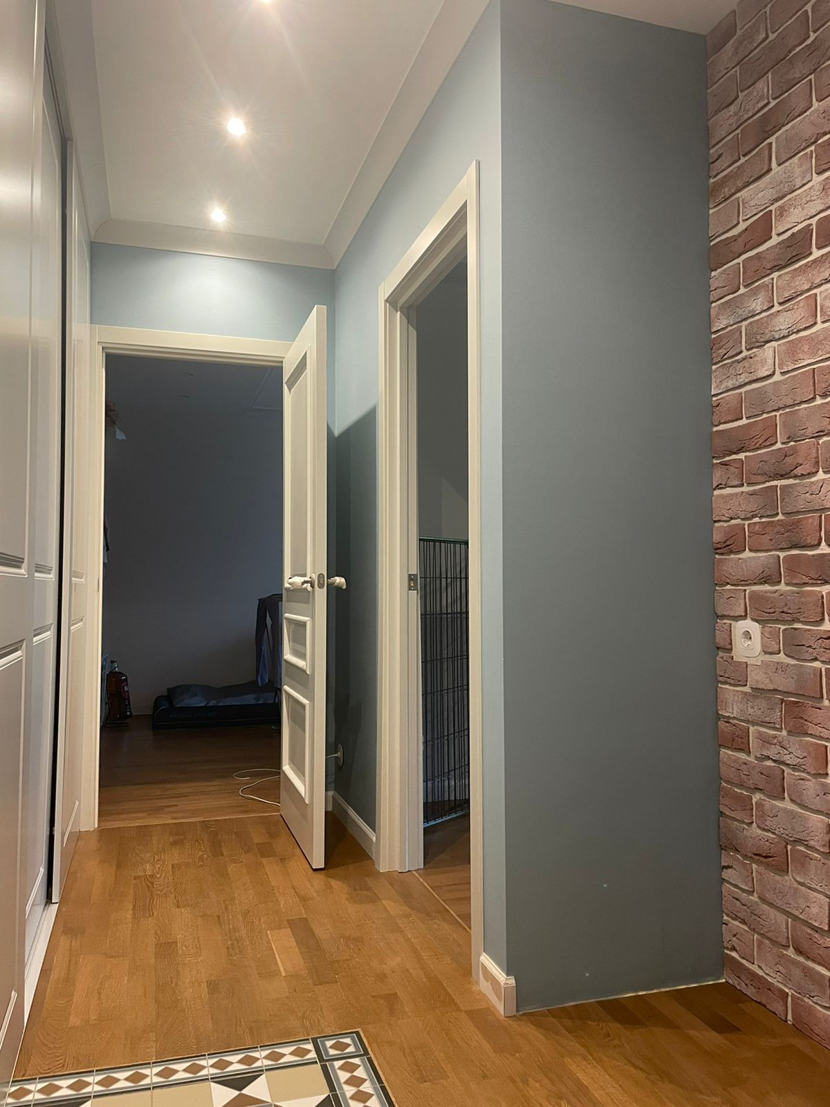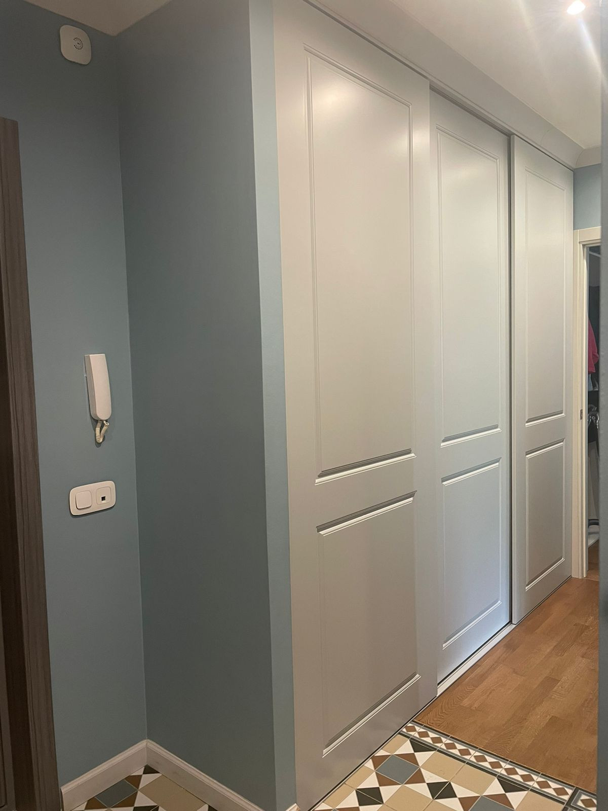 Коридор: просторный, шкаф 2 метра встроенный с местом под хранение сапог, химии, чемоданов, гладилки и сушилки. Проем в стене под комод/диван. Двери новые МДФ.