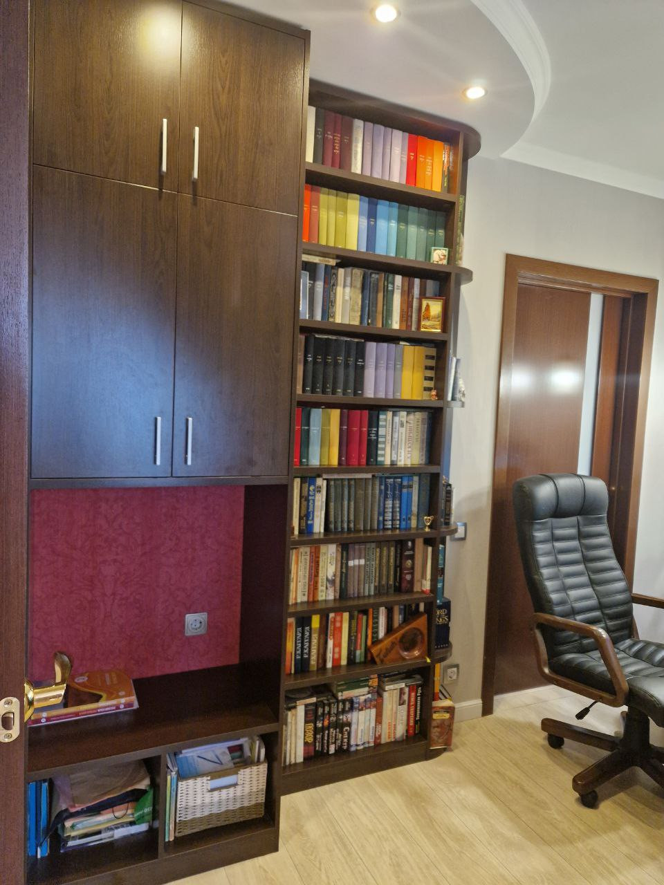 Все коммуникации заменены, продуманно расположение розеток и выключателей (Schneider Unica), многоуровневое освещение позволяет менять настроение интерьера, практически вся мебель встроенная. Мебель, выделенная на плане зелёным цветом, входит в стоимость квартиры, включая всю бытовую технику (Siemens и Bosh). Смежную комнату благодаря грамотному проекту удалось отделить, создав кабинет с библиотекой. В мастер-спальне сделана удобная и очень вместительная гардеробная из качественных материалов (Elfa). Мебель в гостиной-столовой и прихожей выполнена из МДФ со шпоном натурального дерева (дуб, американская вишня), на стенах декоративная штукатурка. Мебель в детской выполнена из натурального дерева (сосна) с гипоаллергенным лакокрасочным покрытием (лак на водной основе), моющиеся обои. Мебель в кабинете – МДФ с экошпоном (Mr.Doors), усиленная полка в нише выдержит любое МФУ.
