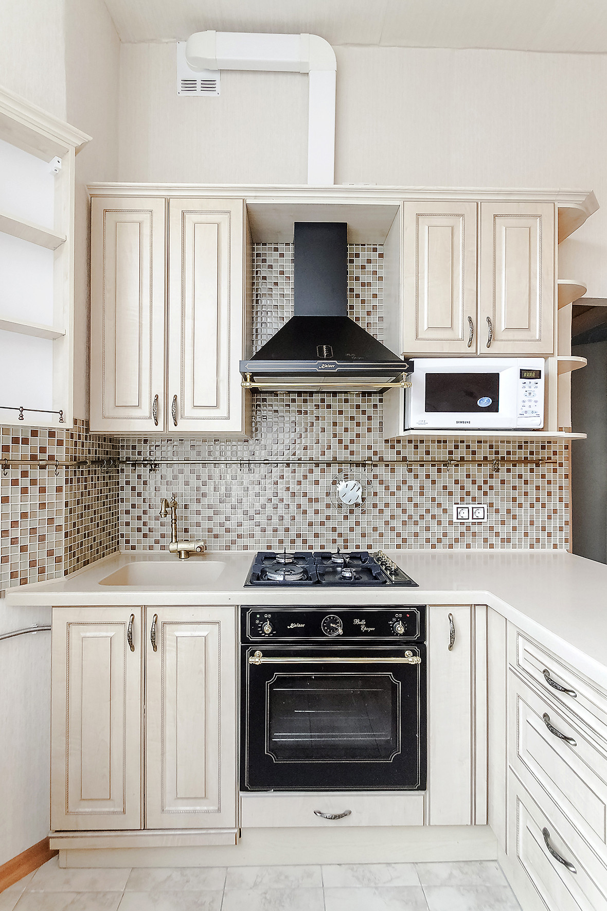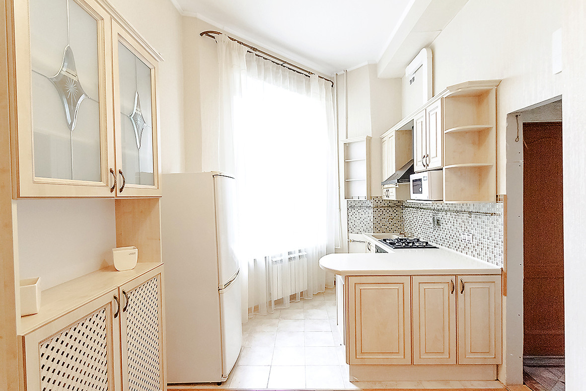 - большая кухня со стильным кухонным гарнитуром и встроенной техникой