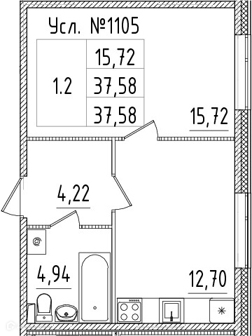 Пол без стяжки, стены без штукатурки, внутриквартирная разводка, электрический счетчик, стояки канализации, стыки зачеканены, канализационные выпуски оборудованы пробками, смонтированы выпуски ГВС и ХВС с установленными заглушками, радиаторы, приборы учета (счетчиков) горячей и холодной воды, отопления, входная металлическая дверь.