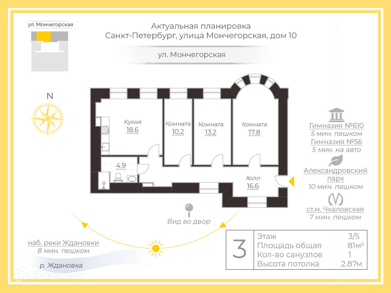 3-комнатная квартира, 81.3 м2, этаж 3 / 5, на продажу в Санкт-Петербурге, Мончегорская улица, 10