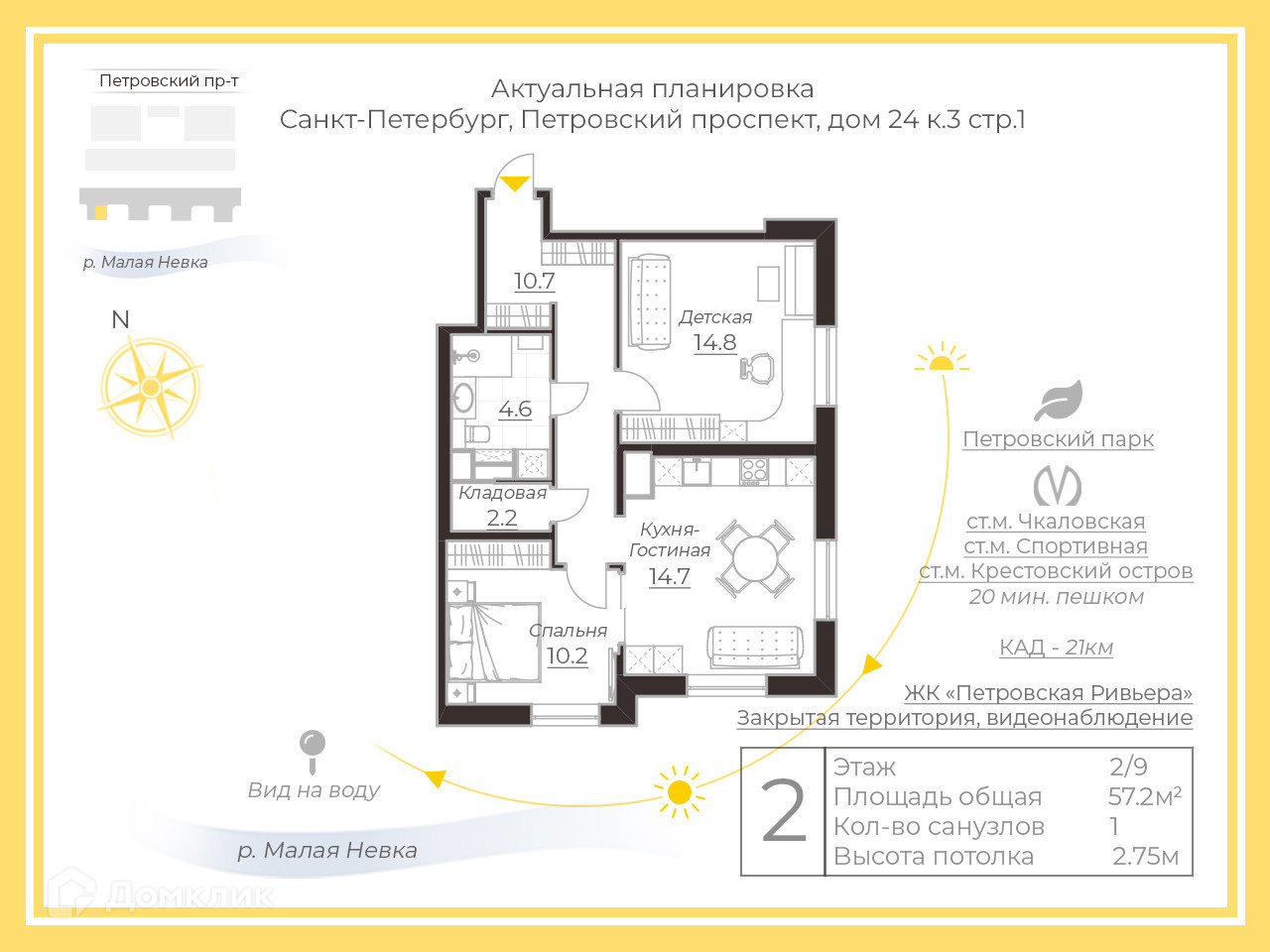 2-комнатная квартира, 57.2 м2, этаж 2 / 9, на продажу в Санкт-Петербурге, Петровский проспект, 24к3
