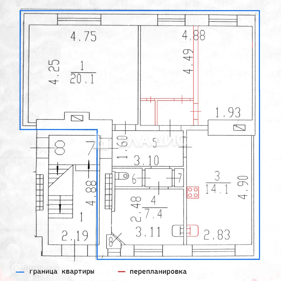 - Неузаконенная перепланировка(обозначена на плане)