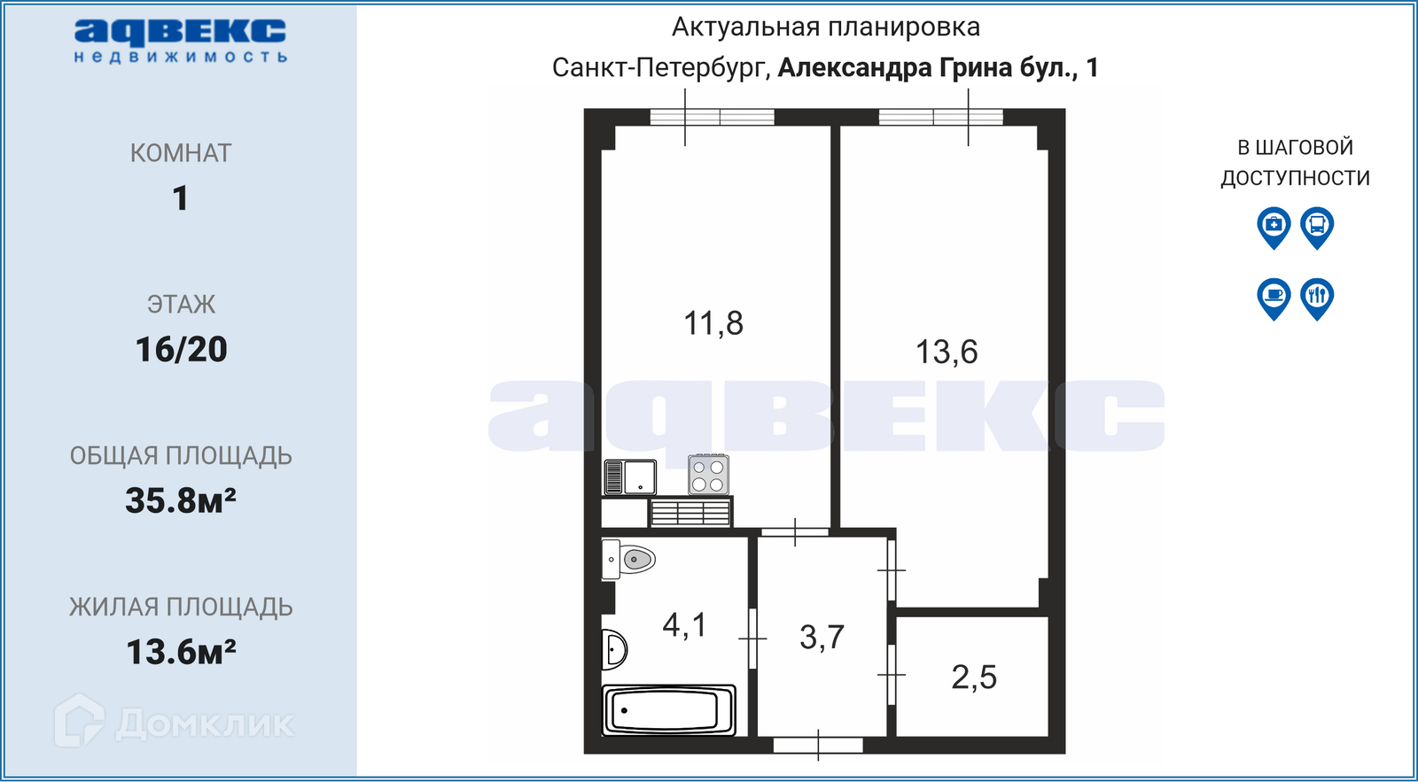 1-комнатная квартира, 35.8 м2, этаж 16 / 20, на продажу в Санкт-Петербурге, бульвар Александра Грина, 1