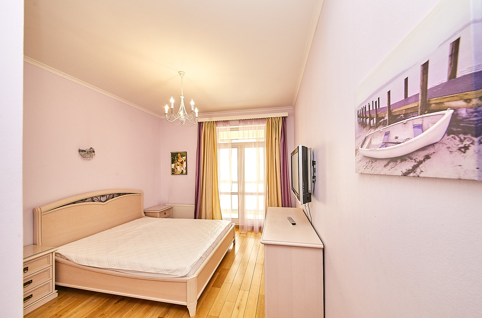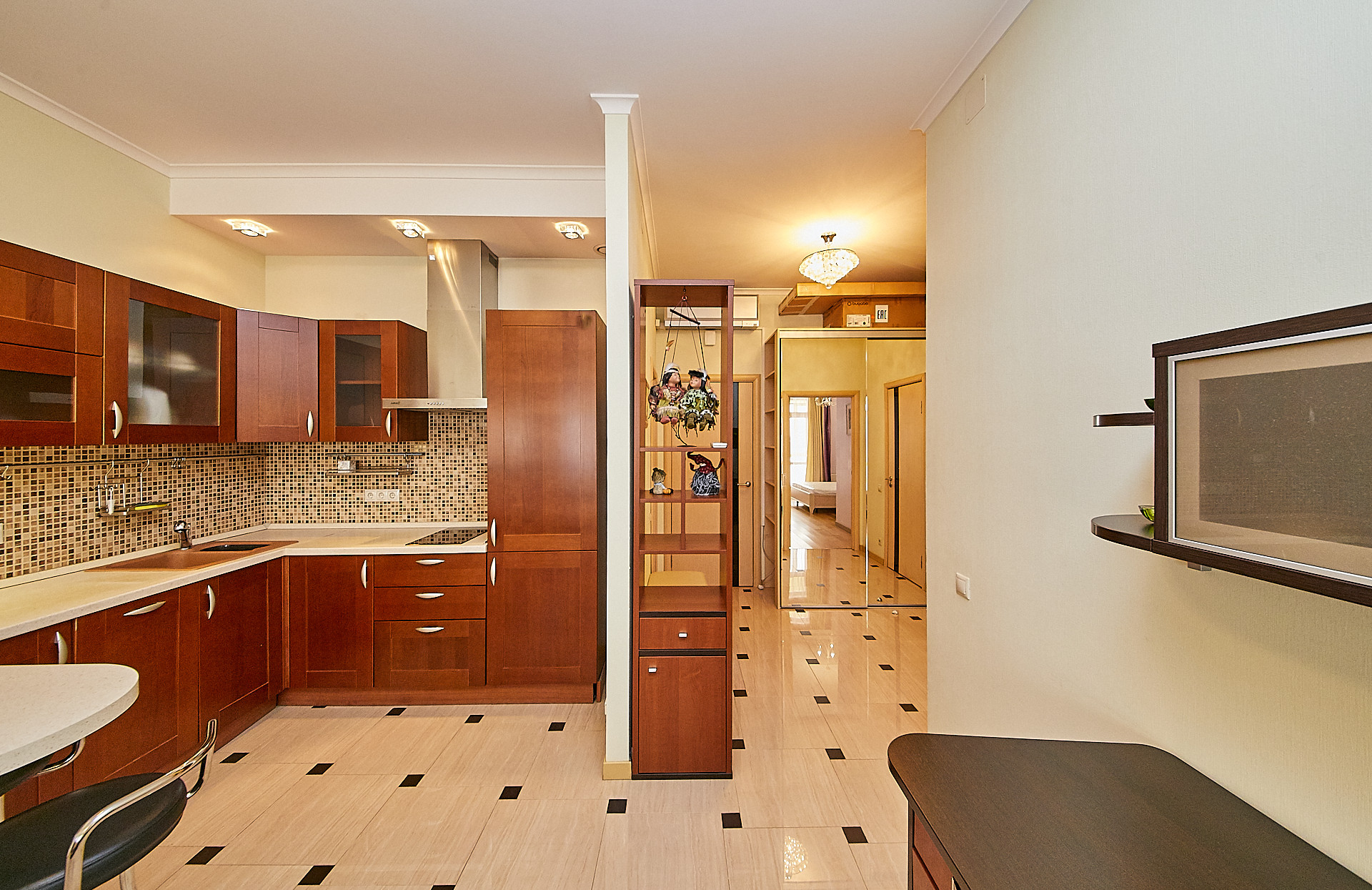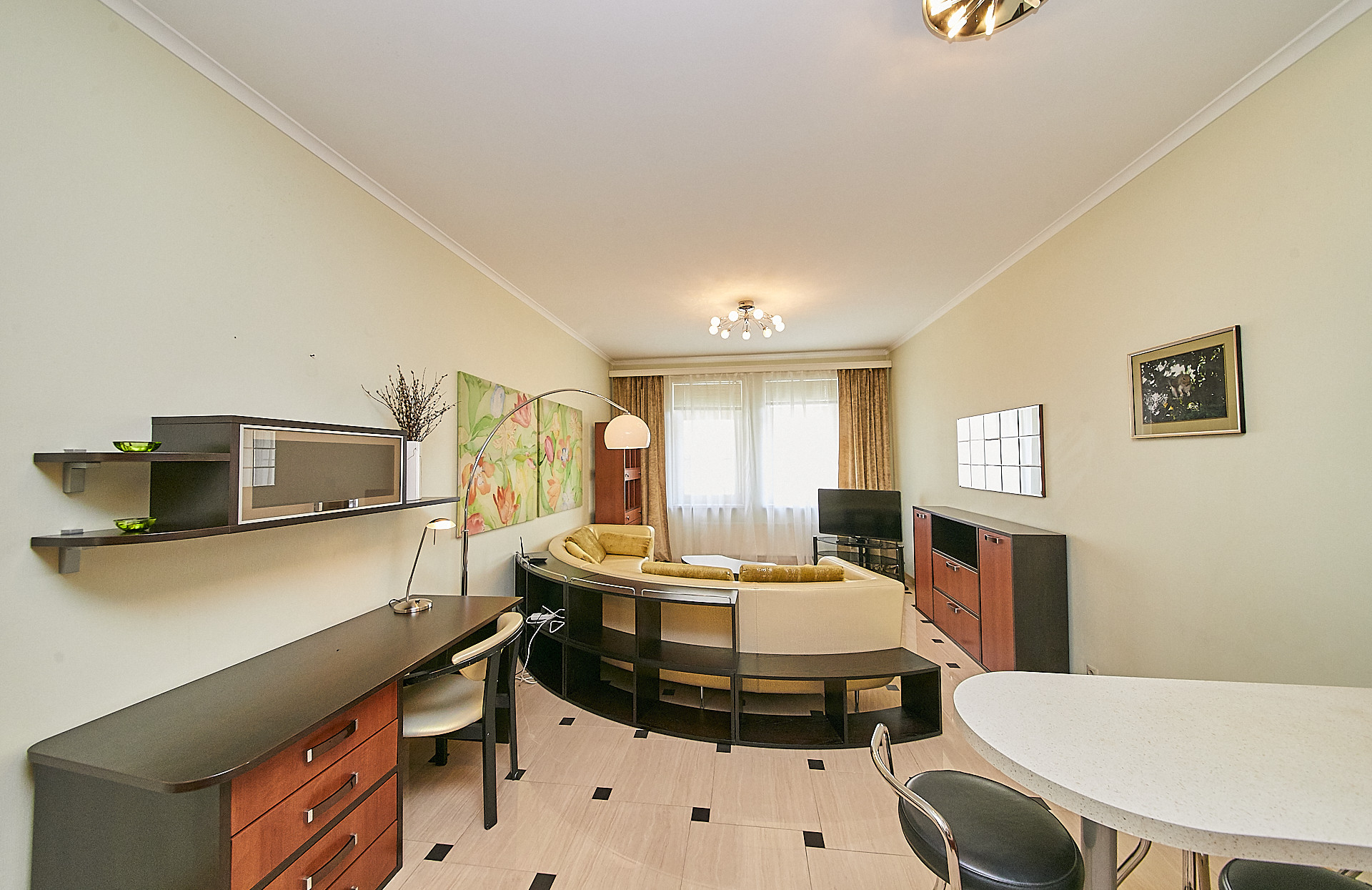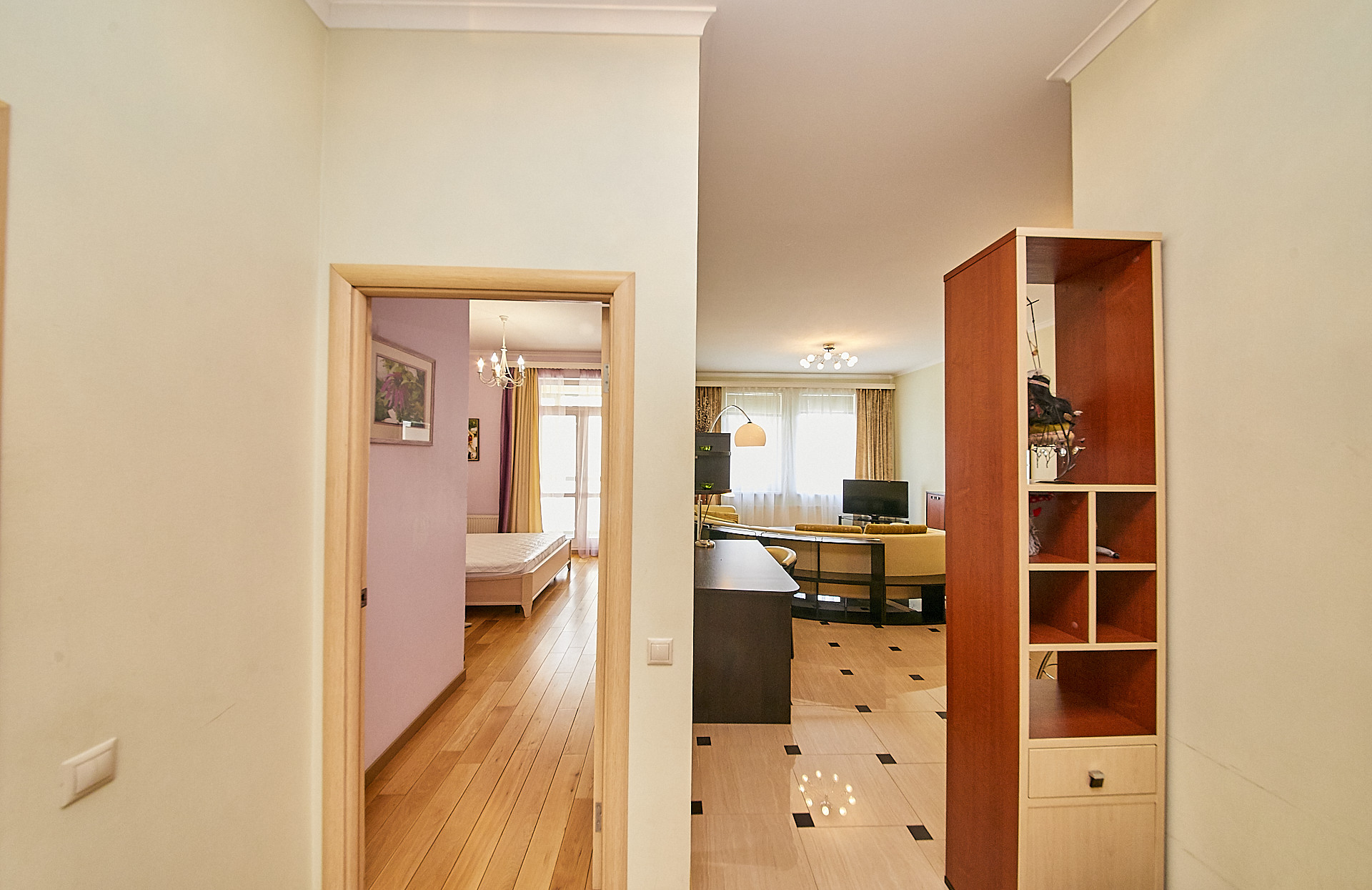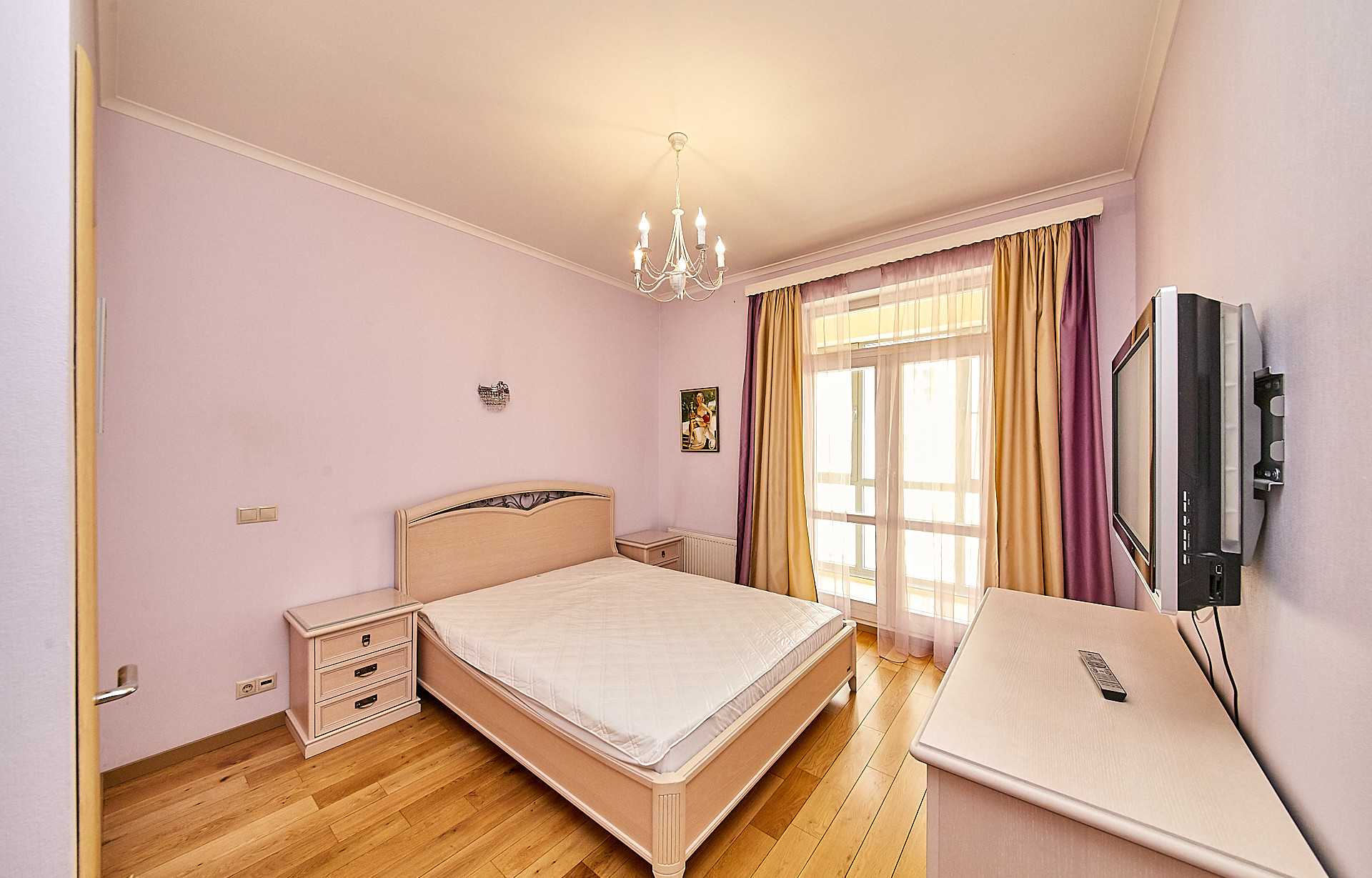 В квартире выполнен качественный ремонт с использованием экологических материалов, деревянные окна со стеклопакетами, установлены кондиционеры, есть все необходимое для комфортного проживания. Большая кухня - гостиная оборудованная современной техникой, изолированная спальня с гардеробной комнатой, а также дополнительная гардеробная в прихожей для чемоданов, сумок, верхней одежды и обуви.