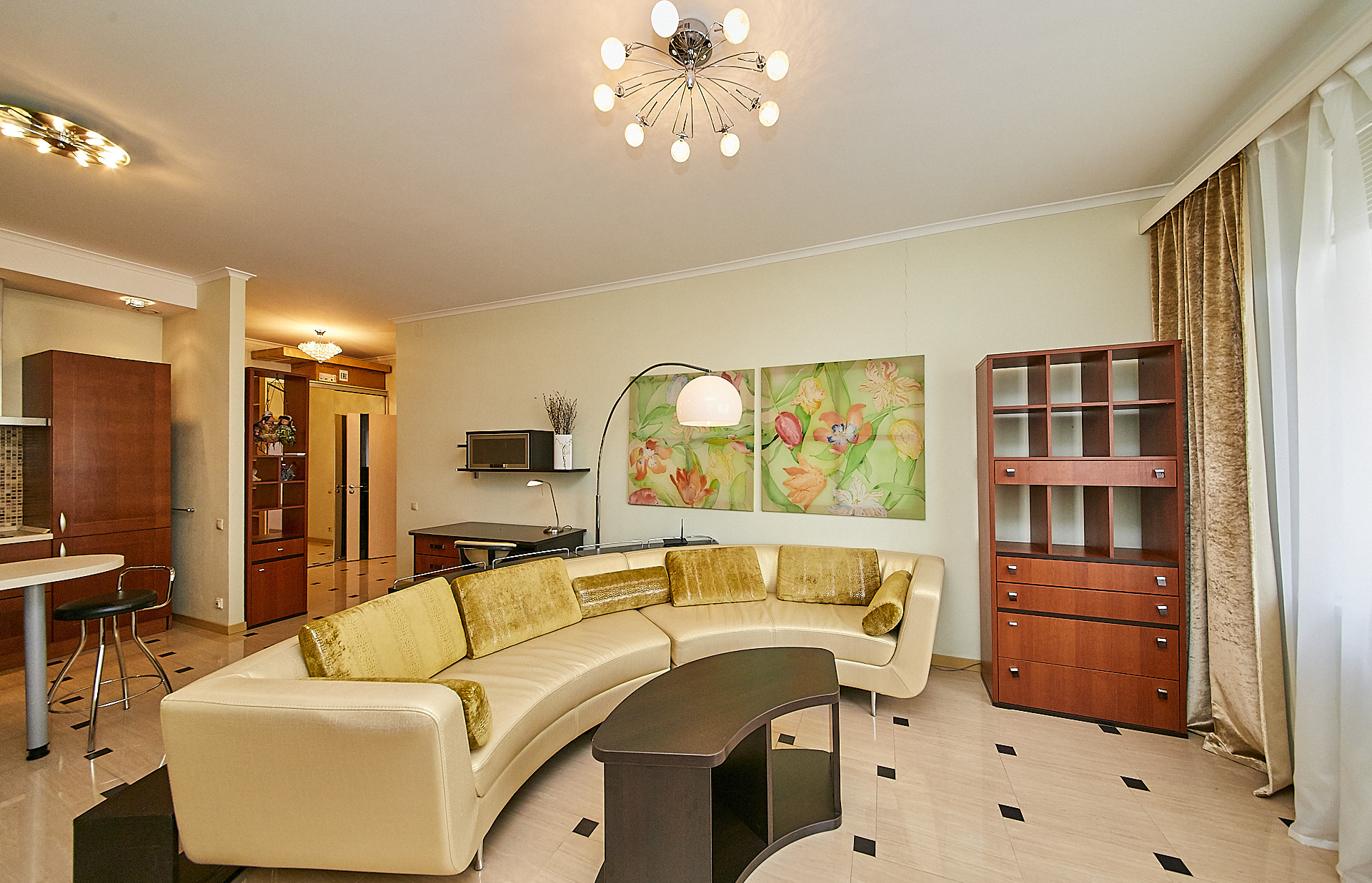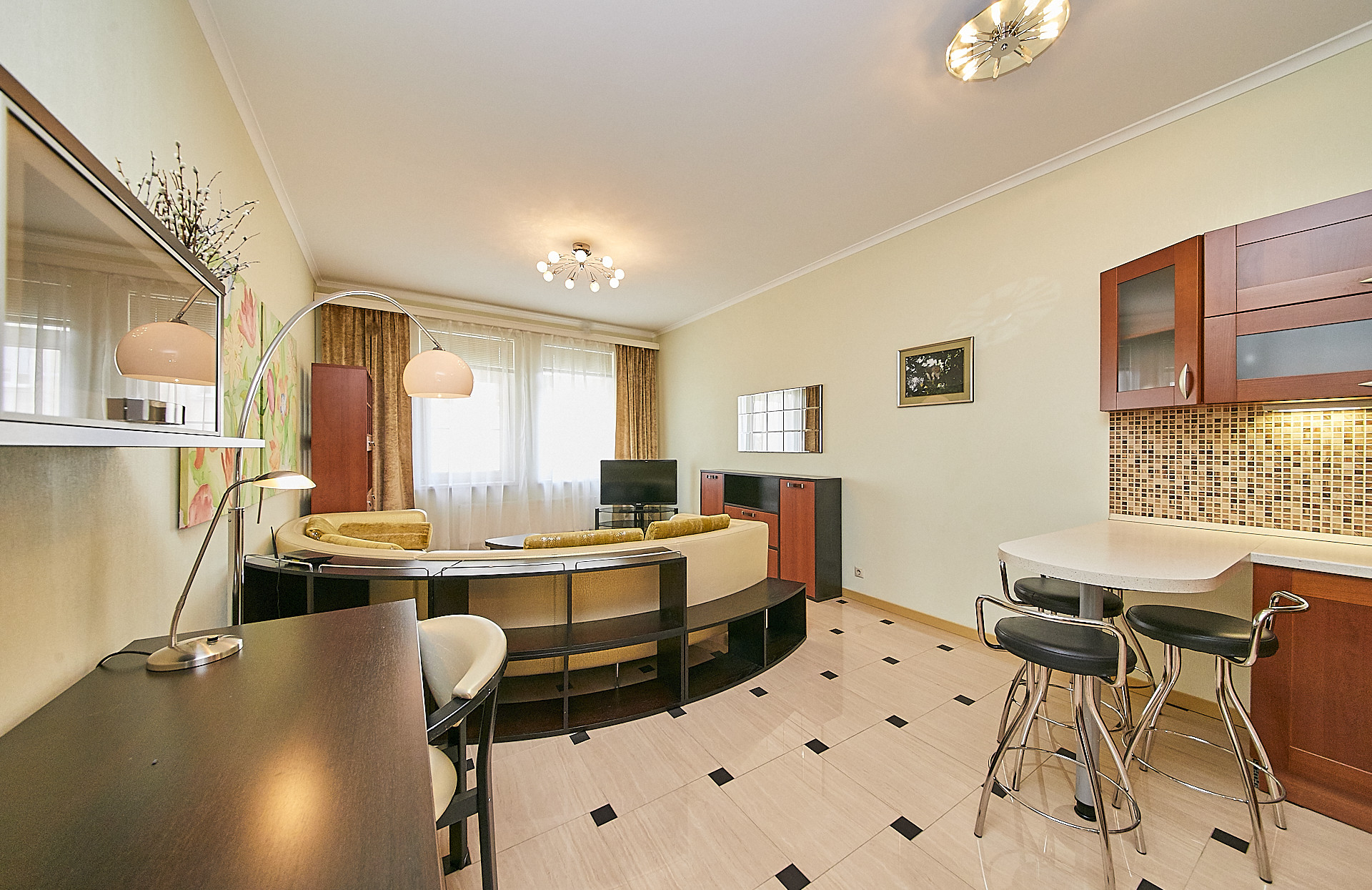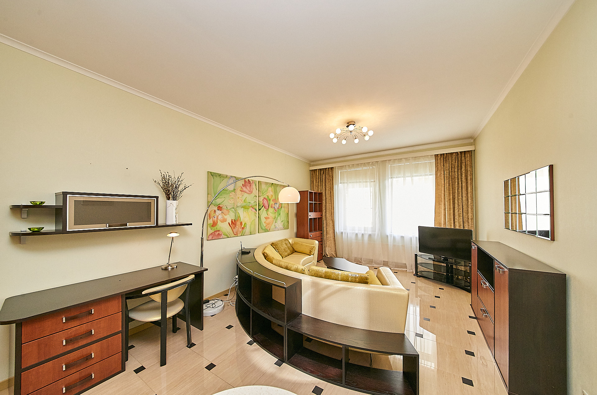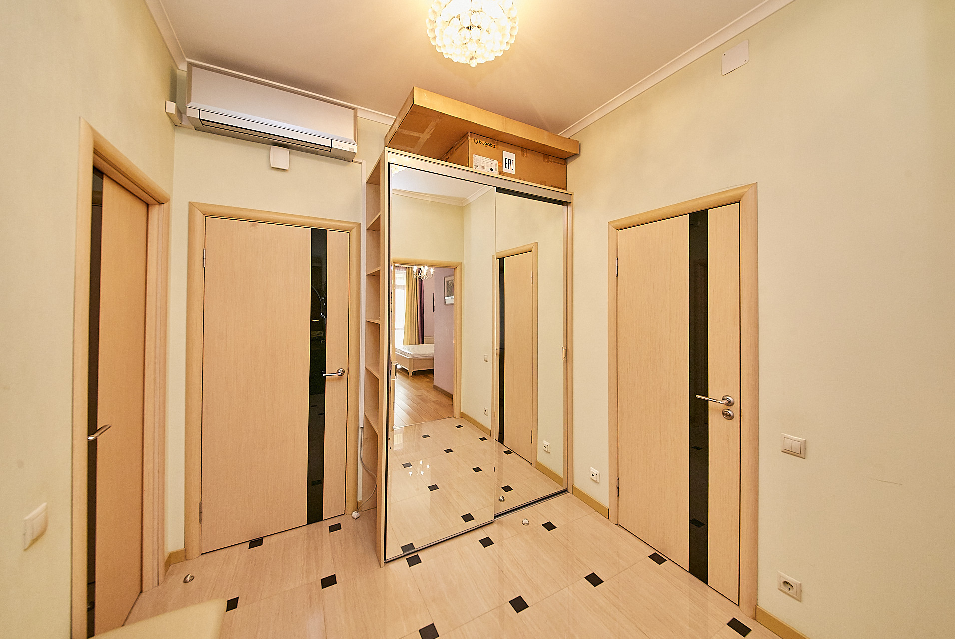 В квартире выполнен качественный ремонт с использованием экологических материалов, деревянные окна со стеклопакетами, установлены кондиционеры, есть все необходимое для комфортного проживания. Большая кухня - гостиная оборудованная современной техникой, изолированная спальня с гардеробной комнатой, а также дополнительная гардеробная в прихожей для чемоданов, сумок, верхней одежды и обуви.