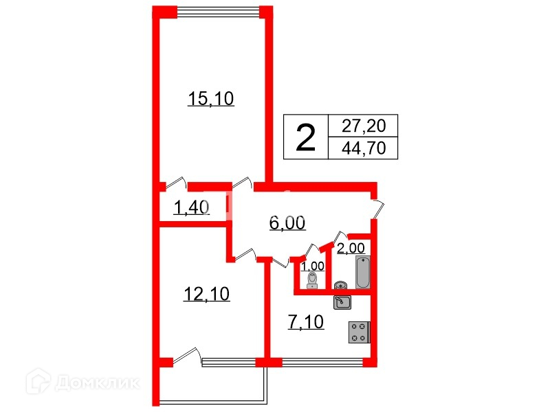 Общая площадь 44.7 м2