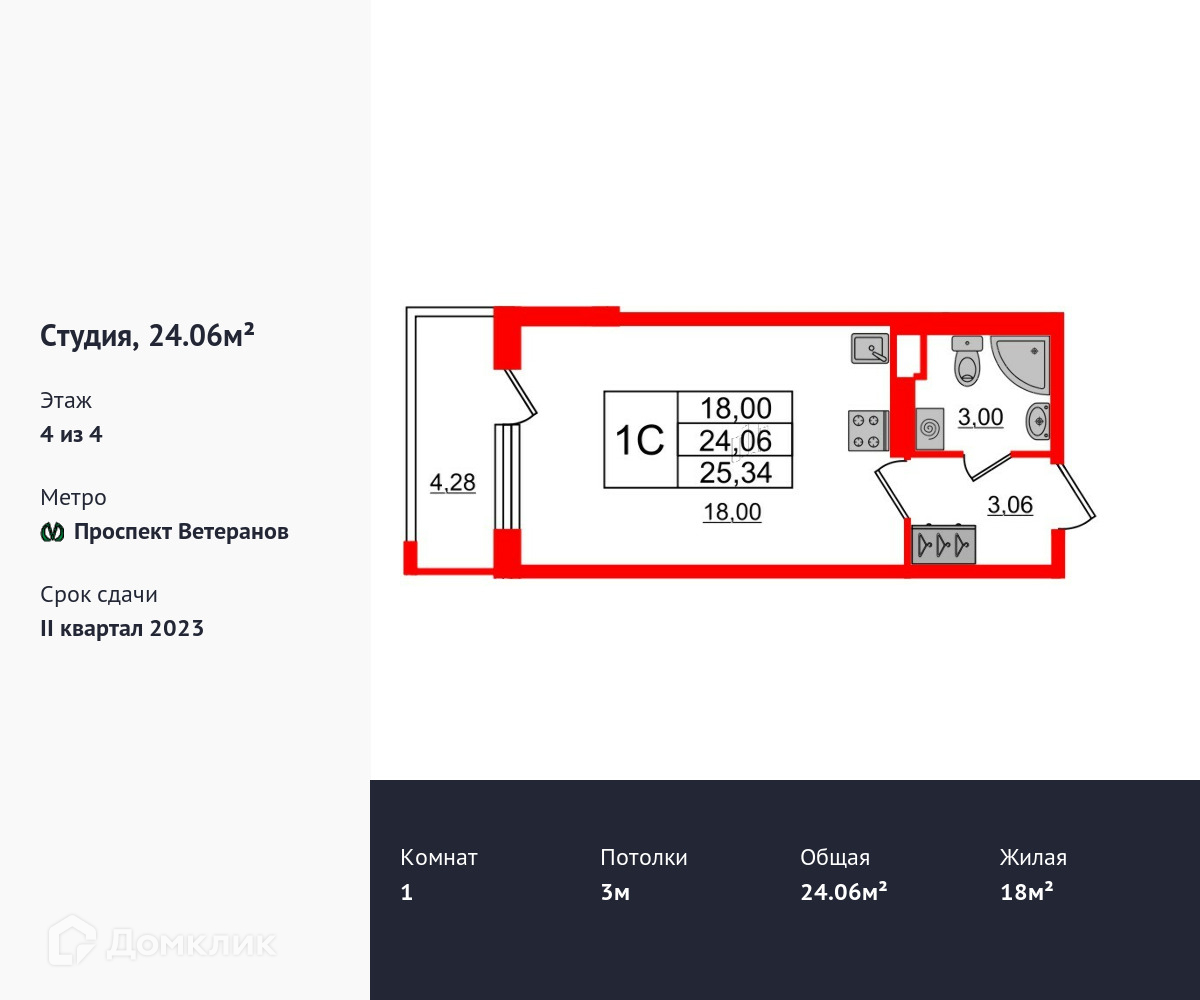 Удобная, классическая, функциональная европланировка, вместительная прихожая 3.06 м². Общая площадь студии - 24 м², жилая – 18 м², высота потолка 3 м.