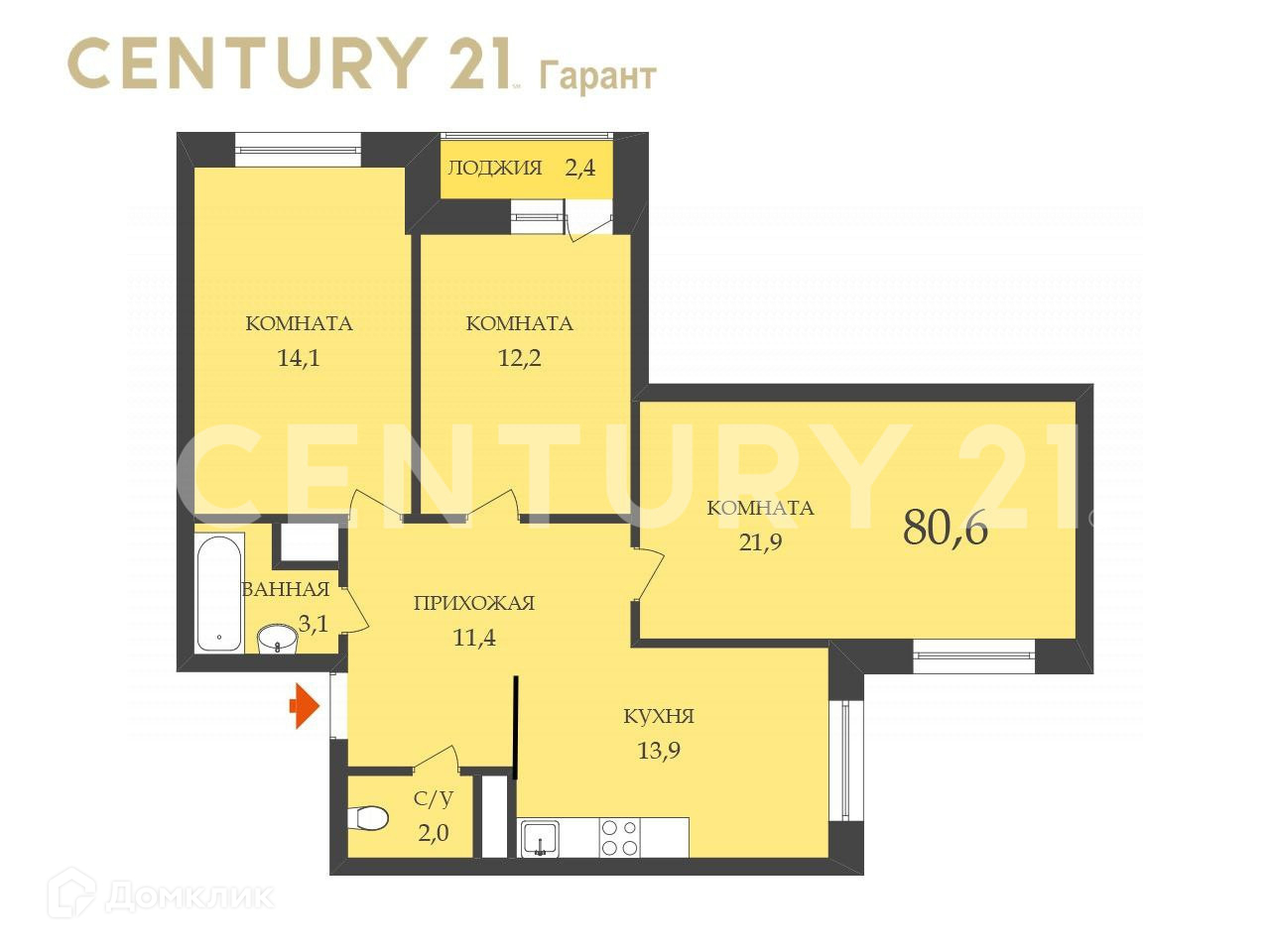 · 3 изолированные комнаты 21.9 кв.м.,16.1кв.м., 12.2 кв.м. Общая площадь – 81.8 кв.м., включая лоджию 2.4 кв.м. Жилая площадь – 50.2 кв.м. Кухня 13.9 кв.м.