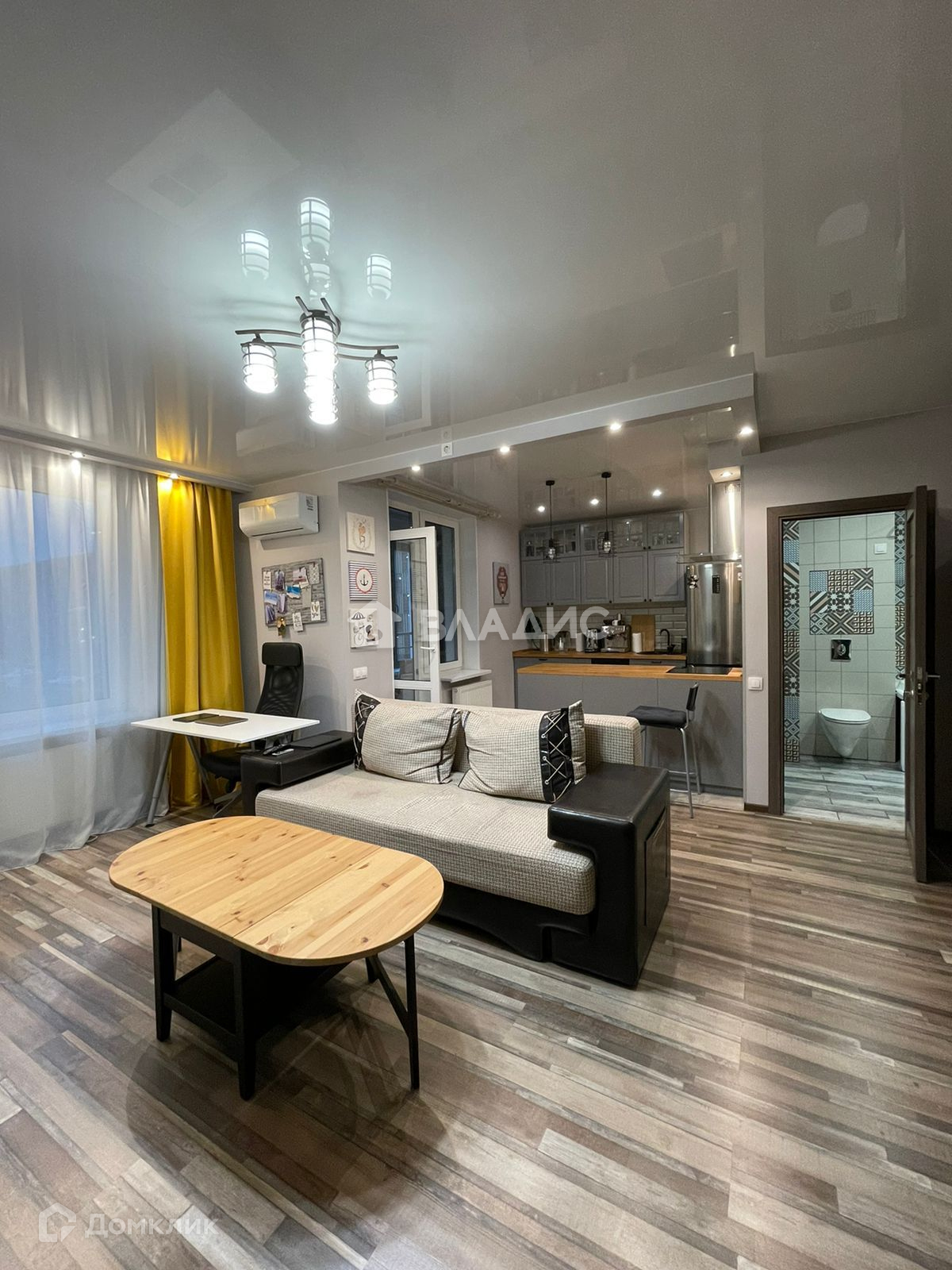 Совмещенная гостиная с кухней оборудованная кондиционером, санузел также совмещен, есть стиральная машина