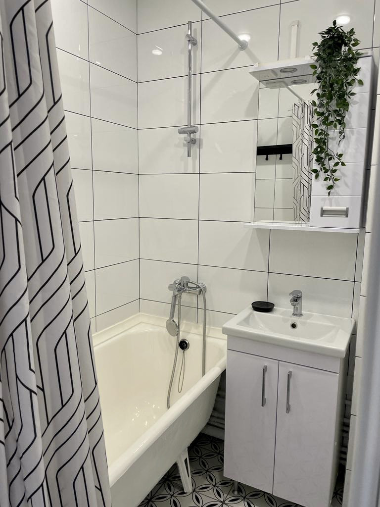 - совмещенный санузел: в кафеле (даже под и за ванной), с встроенной вытяжкой, запитанной на общий свет в ванной, крутая разводка воды для самых взыскательных, есть удобный гигиенический душ, новые смесители, восстановленная чугунная ванная, уже повешены металлические полочки, зеркальный шкафчик и тумба с раковиной, хорошее освещение;