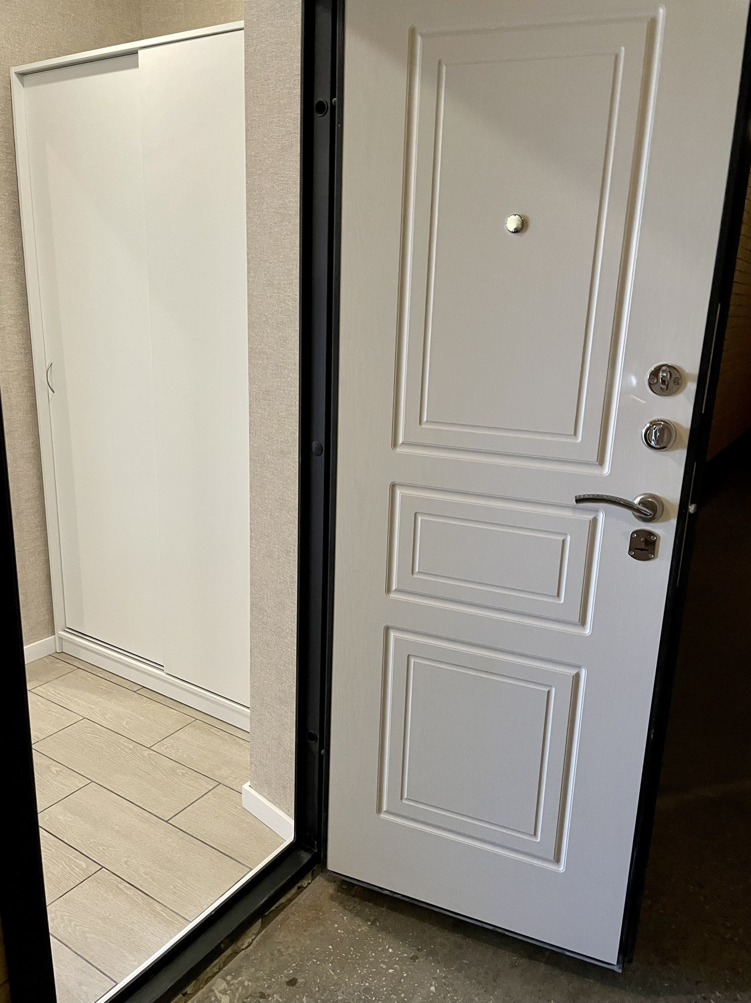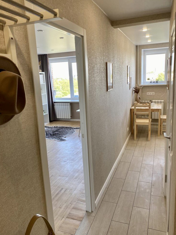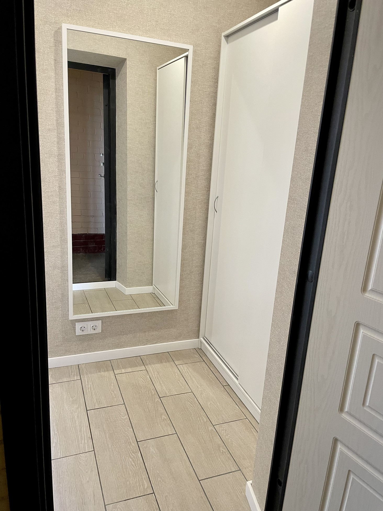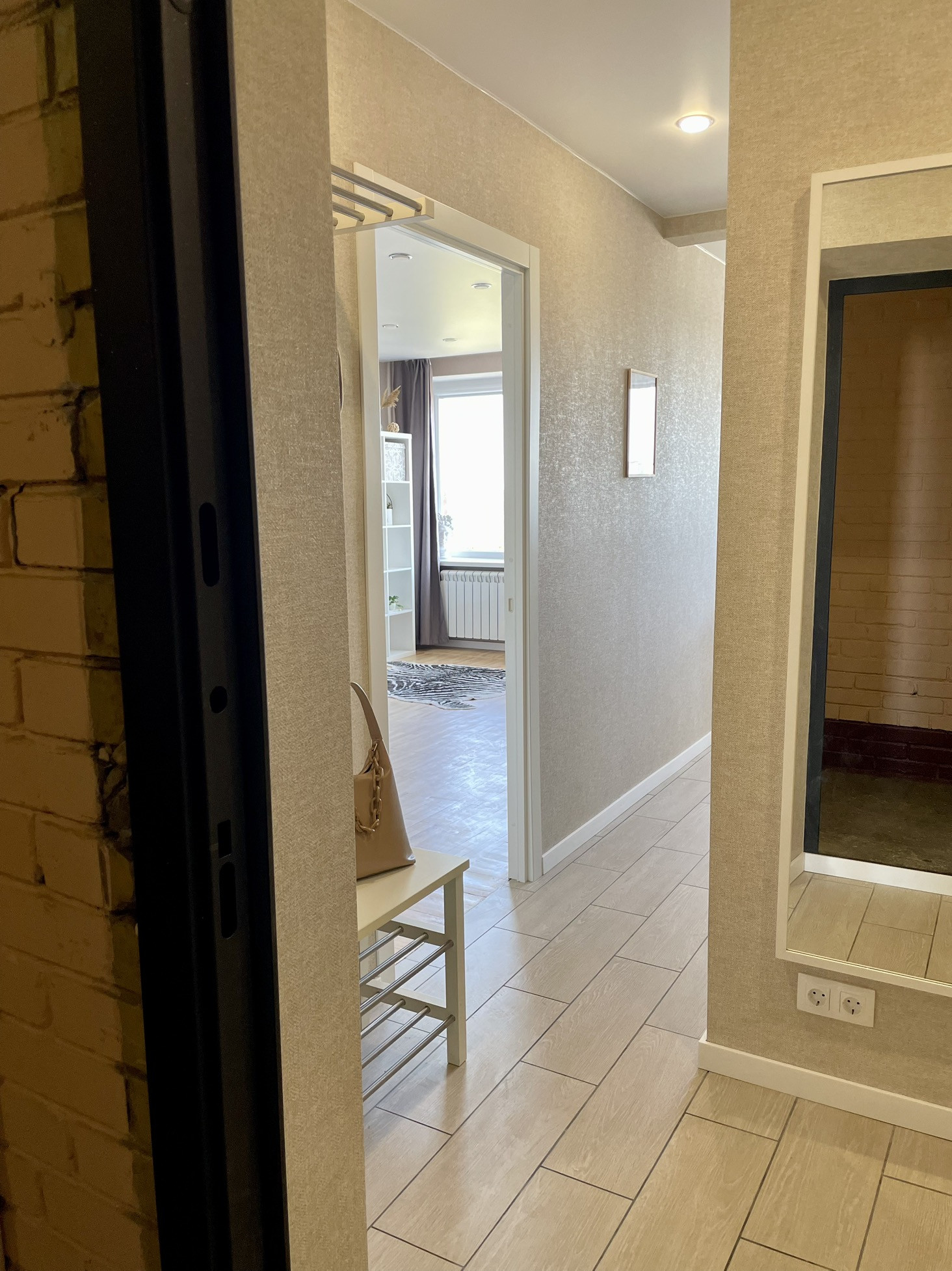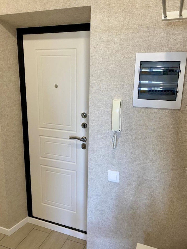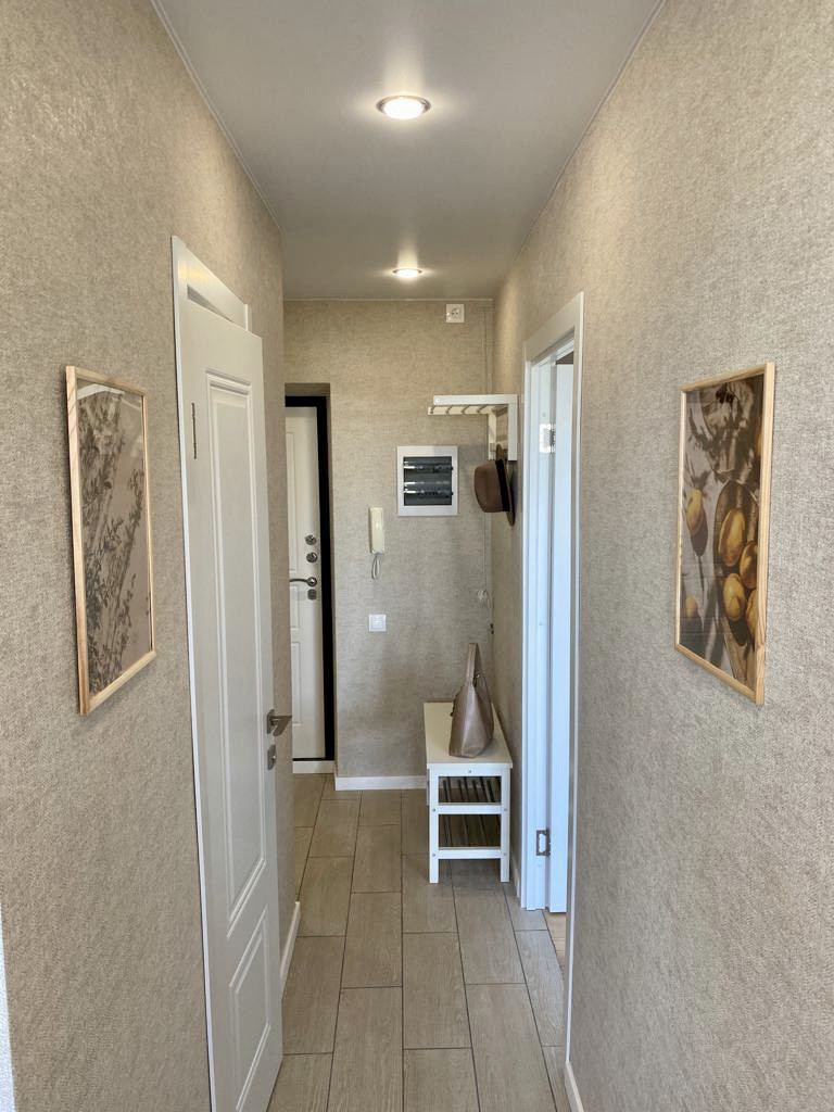 - коридор с квадратной прихожей, установлена новая входная дверь, в нише вместительный шкаф, большое зеркало во весь рост, розетки под электросамокат, моноколесо, сушилку обуви, фен и т.д., интернет провод и отдельная розетка под роутер, скамейка и вешалка Чусиг Икеа;
