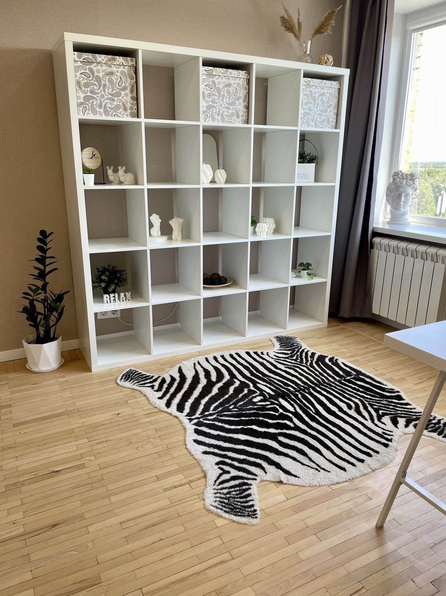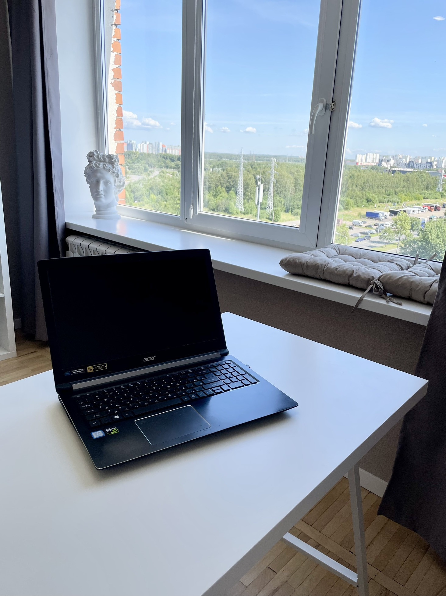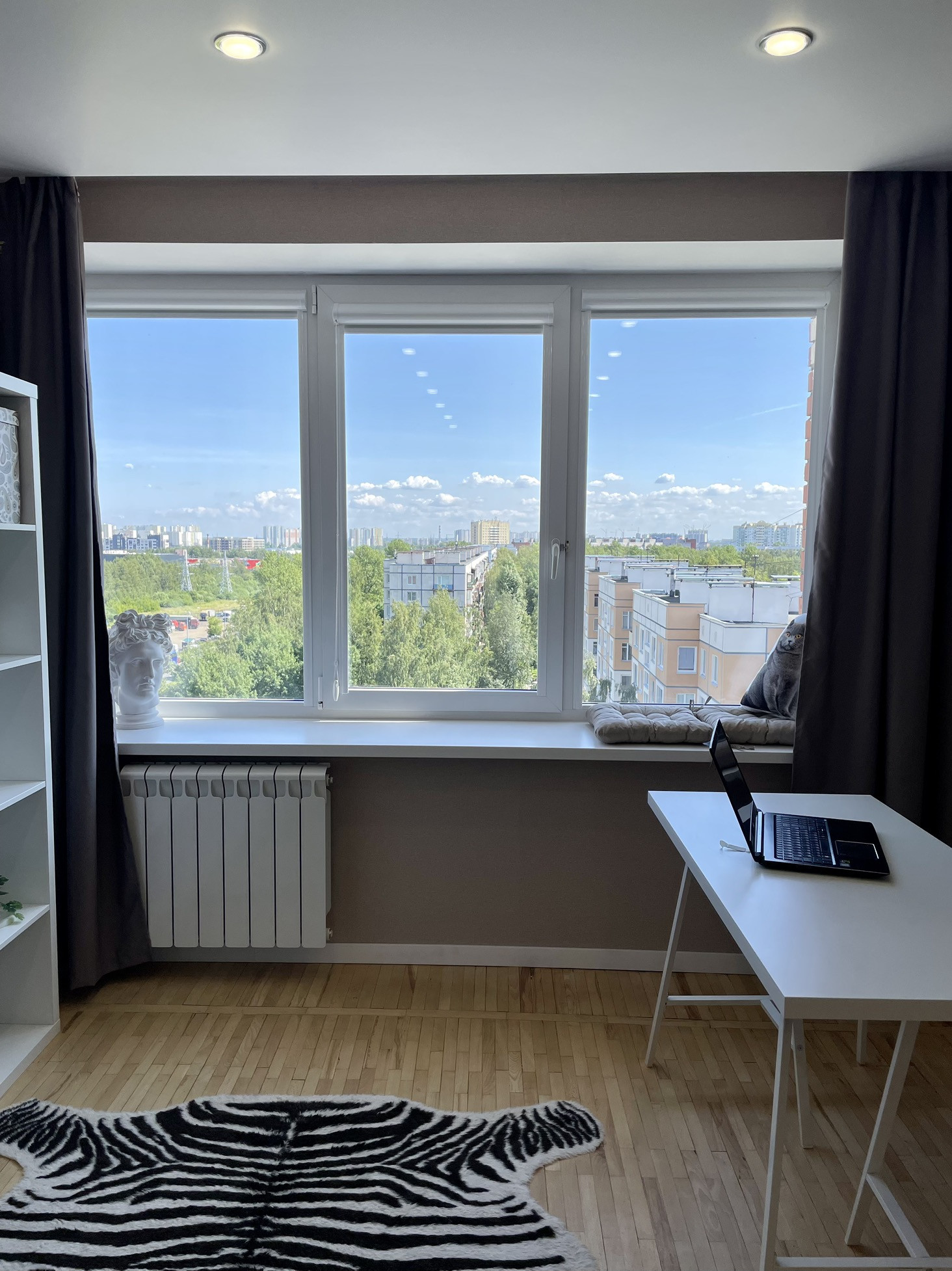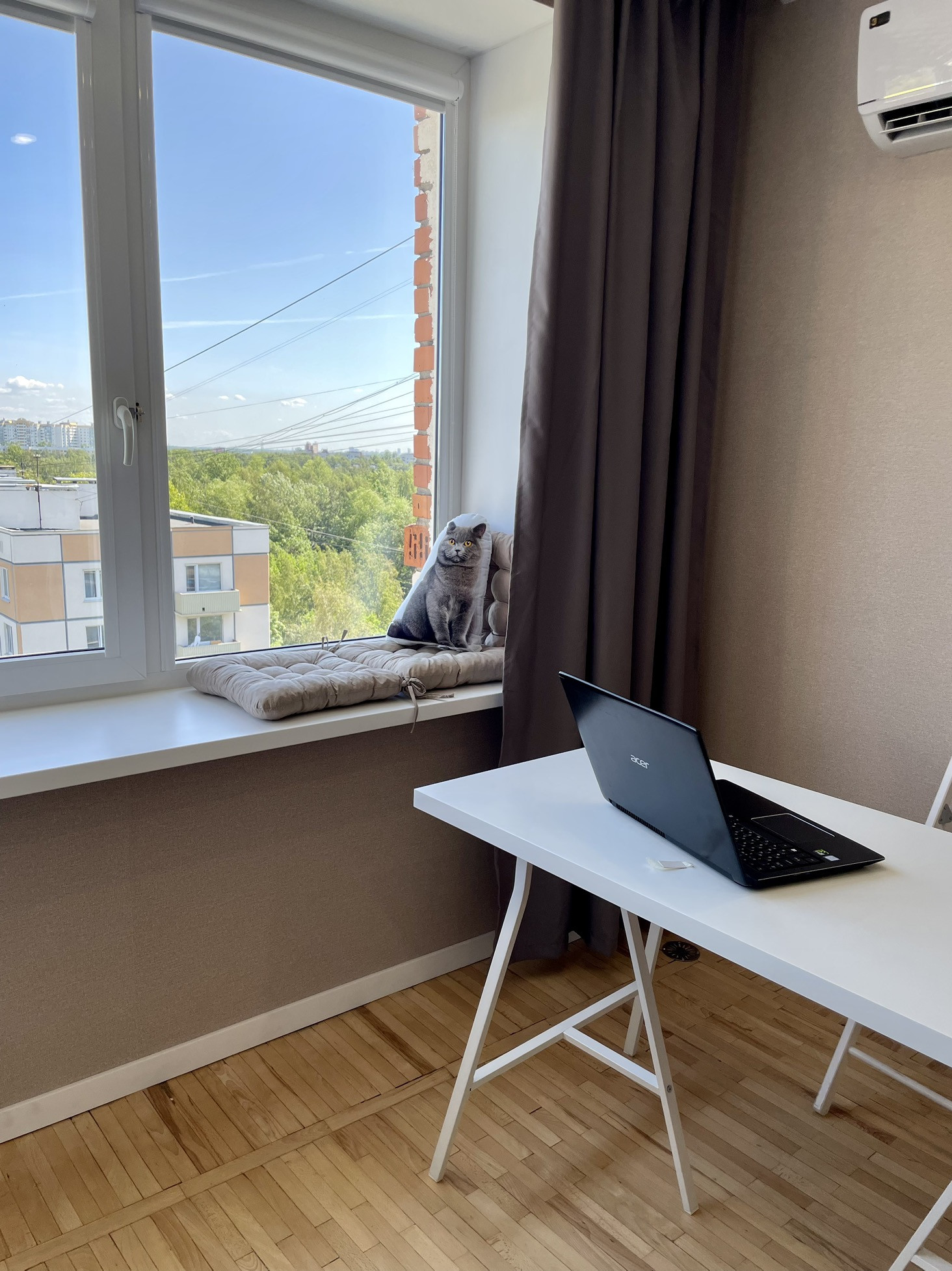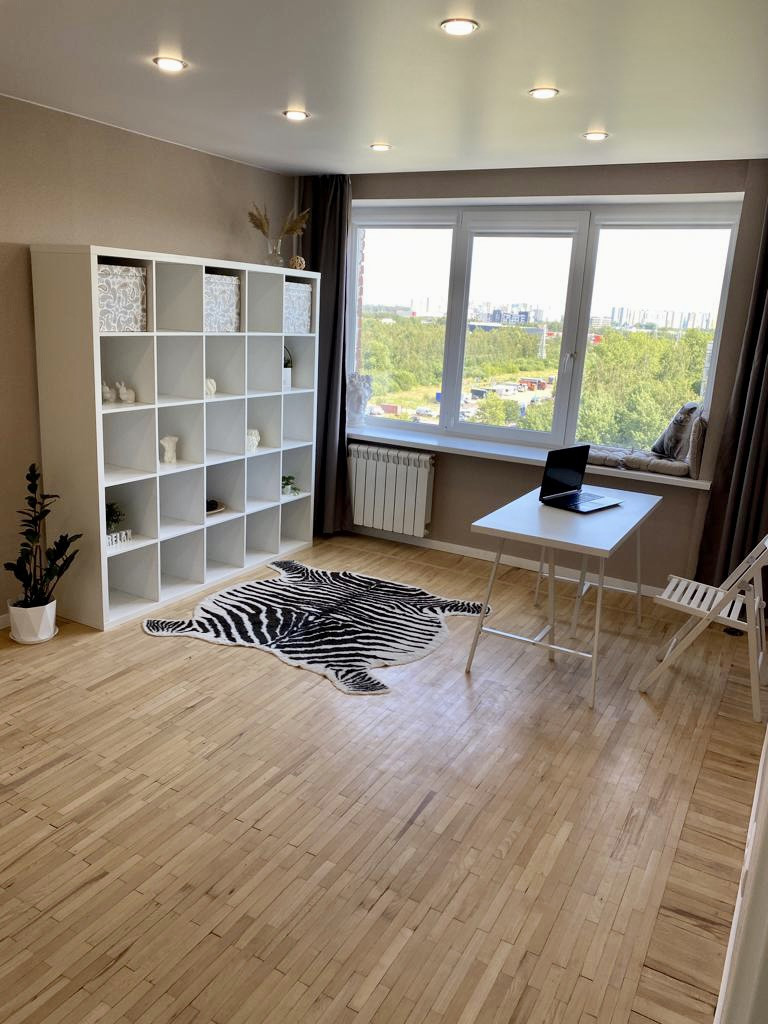 - большая комната 21,3 кв.м, можно зонировать на спальню и гостиную, на полу натуральный паркет, много розеток, кабель под телевизор выведен в специальную розетку, окно почти во всю стену, глубокий подоконник можно использовать для сидения, в качестве стола или фотозоны для товара, на окнах установлены ролеты блэкаут, в комнате кондиционер, хорошее освещение;